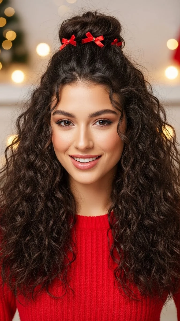 This style is a favorite for a reason. It gives you the best of both worlds. Pull the top half of your hair into a small, messy bun on top of your head. Leave the bottom half flowing freely. To make it festive, tie tiny red bows onto a few bobby pins and stick them into the bun. You can buy a bag of pre-made bows for very little. It’s a trendy, youthful look that works for any casual holiday gathering. It also helps control volume if your hair tends to get too “big” in the cold.