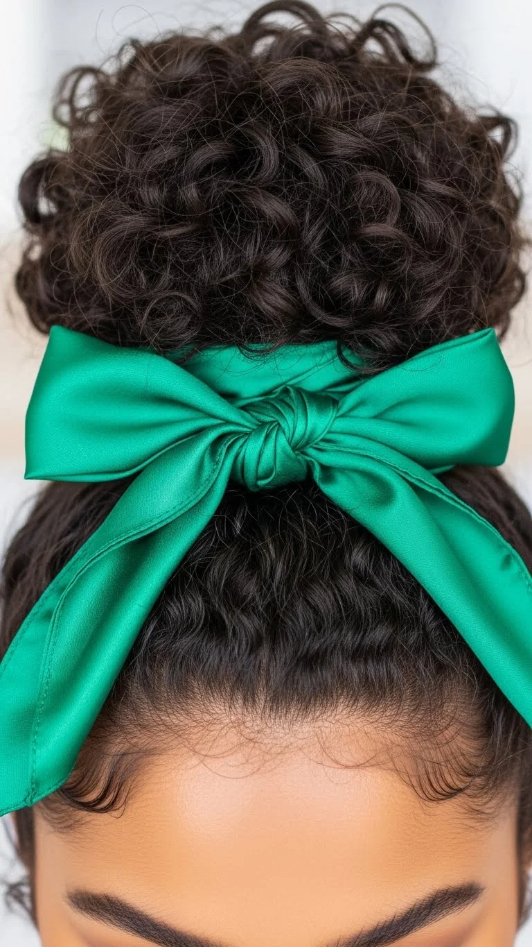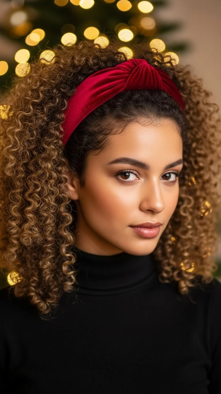 This is the fastest way to look festive. Pull the top section of your curls back toward the crown. Secure it with a small elastic first to keep it tight. Then, tie a long velvet ribbon over the band. You can buy a spool of ribbon at a craft store for a few dollars. It looks much more expensive than a standard hair tie. Let the ends of the ribbon hang long to mix with your curls. This keeps hair out of your face while you eat dinner. It works on day-two curls perfectly. If your ends look dry, add a tiny bit of water or oil.