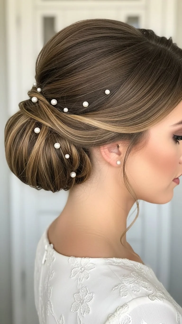 The side bun is slightly more playful than a center bun. Pull your curls to one side and pin them into a soft, round shape. Instead of one large accessory, use several pearl bobby pins scattered throughout the bun. It looks like little snowballs. This is a very elegant look for a holiday wedding or a formal dinner. It’s a great way to hide uneven curl patterns on the back of your head. Keep the pins secure by crossing them in an “X” shape.