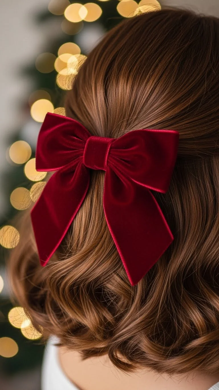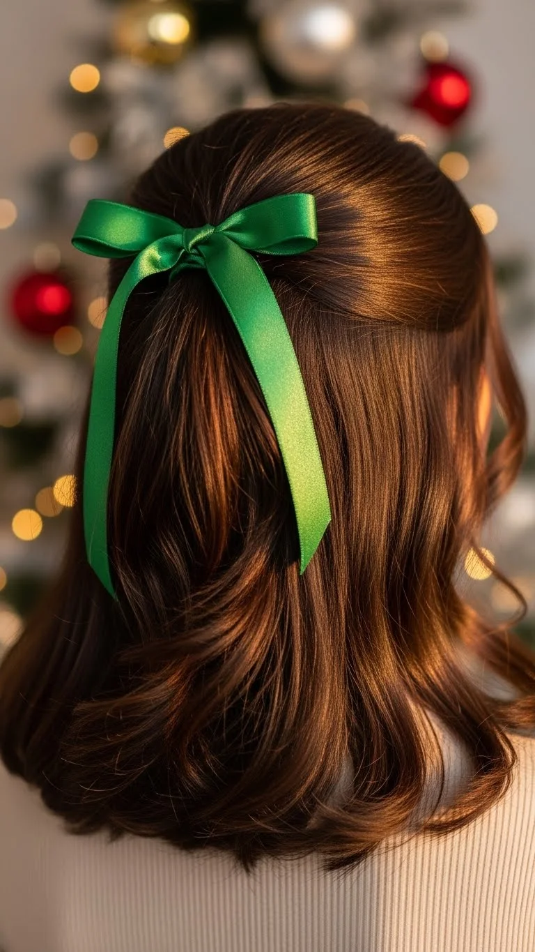 A half-up style always feels sweet, and adding a ribbon gives an instant holiday touch. Gather the top section of your hair and tie it with a satin bow. Choose classic colors like red or green, or go neutral with champagne or black. Satin ribbons are cheap and easy to reuse. Curl the ends lightly if you want extra movement, but straight hair works too. You don’t need perfect lines—slightly loose pieces make the style feel natural. If your ribbon slips, secure the hair with a small elastic first and then tie the ribbon around it. For short or thin hair, stick to a smaller ribbon so it doesn’t weigh the style down. This is a great go-to look when you’re in a hurry but still want something festive.