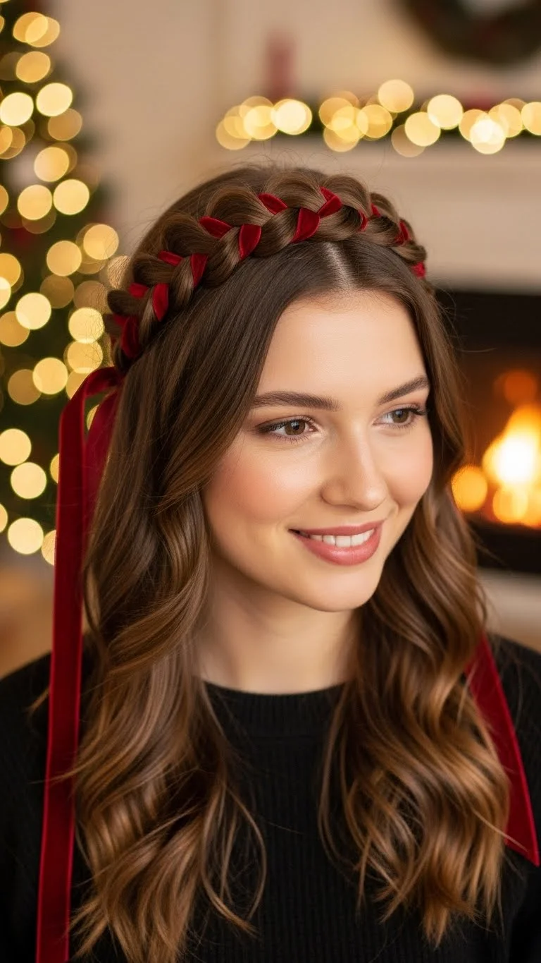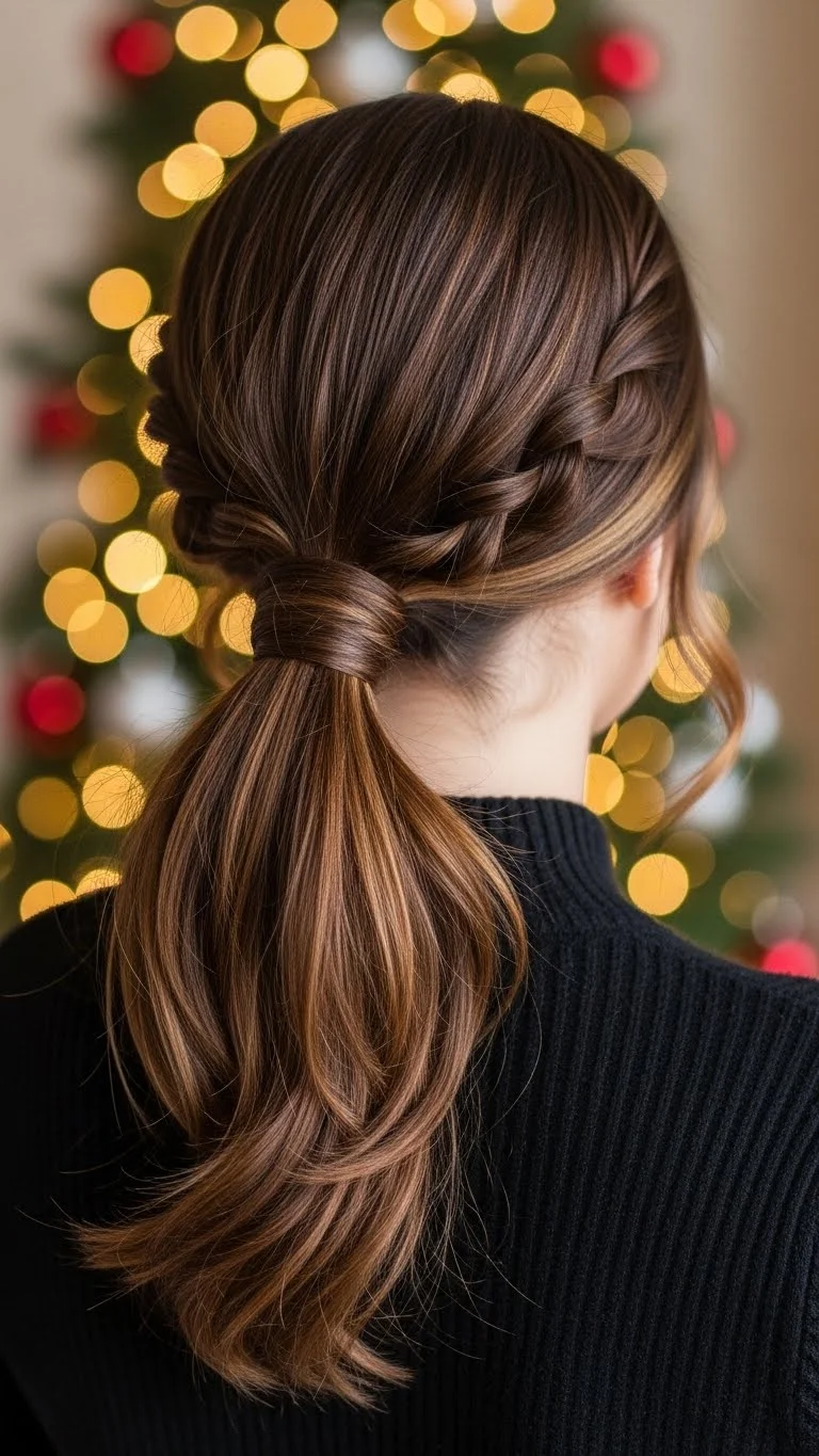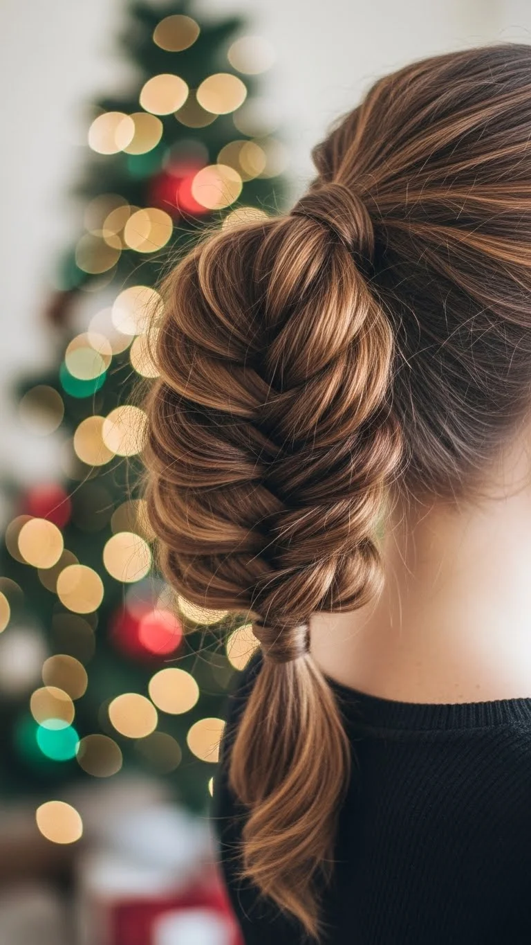 A messy braided ponytail feels casual and cute. Tie your hair back, braid the ponytail loosely, and pull a few strands out around your face. Add a festive ribbon at the base. If your hair is shorter, braid only the top section and tie it back. This style works well for running errands or relaxed family events. It’s quick, low-cost, and easy to adjust.