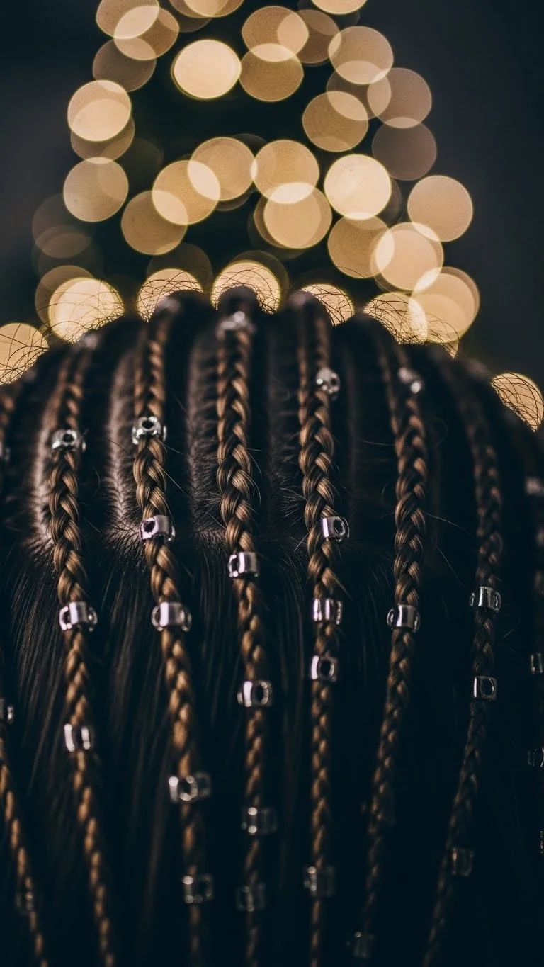 Mini braids feel playful and are easy to personalize. Create three or four small braids around your head. Add tiny metallic beads at the ends. Packs of beads cost very little at craft stores. Secure them with mini elastics so they don’t slip. This style works on both straight and curly textures. If your hair is shorter, braid just the front sections. It gives a fun holiday sparkle without taking long.