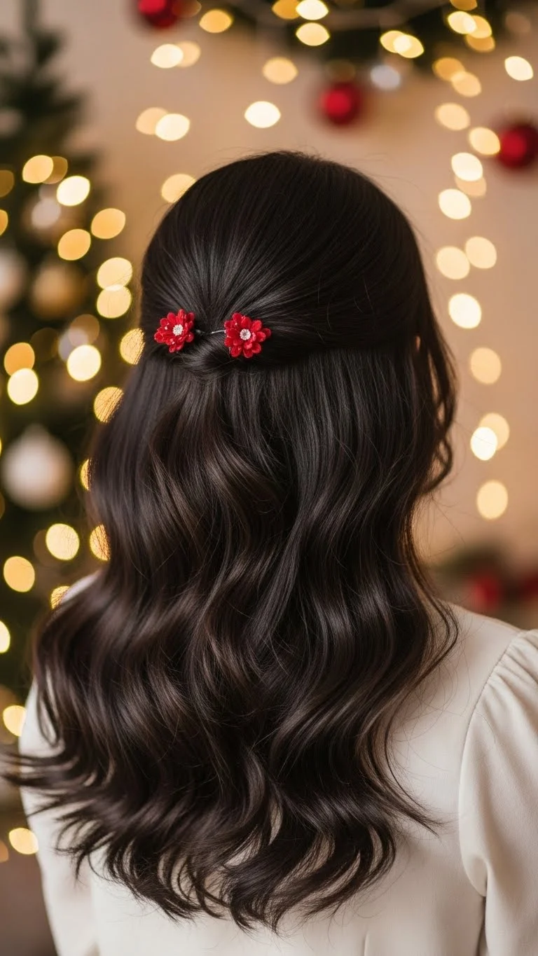 Flower clips add a warm holiday touch, especially red or deep burgundy ones. Wave your hair lightly, then pin a flower clip above one ear. You can buy pairs for low cost. If your hair is straight, add texture spray to help the waves last. For shorter hair, use smaller clips so they don’t look heavy. This style is perfect for both casual gatherings and holiday photos.