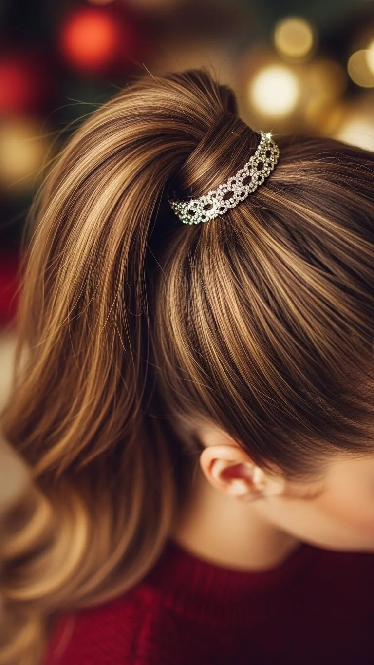 A high ponytail becomes party-ready with a sparkle wrap. Pull your hair up, secure it, and wind a glitter ribbon or metallic thread around the base. This accessory is cheap and easy to find. Curl the ponytail ends if you want movement. If your hair is shorter, do a half-up high pony instead. This look feels fun and works well with bright outfits.
