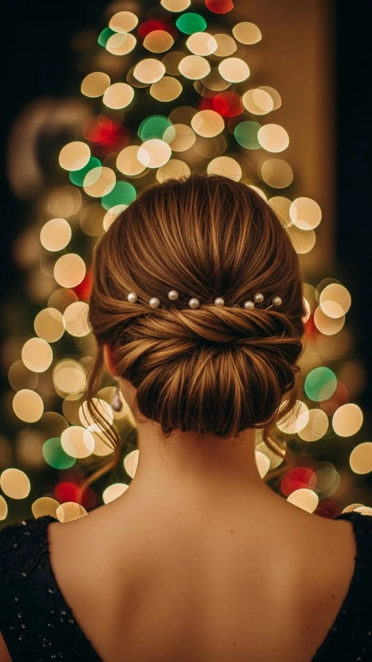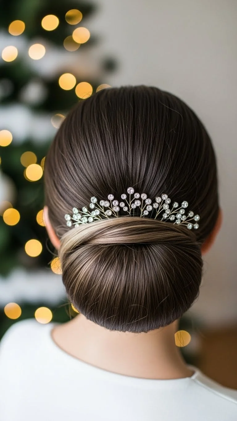 A low bun takes only minutes and looks polished without trying hard. Brush your hair back, twist it into a small bun, and secure it with bobby pins. Add two or three sparkly clips or crystal pins around the bun. You can find multi-packs at very low prices online or at local shops. They give a festive hint without feeling heavy. Leave a few face-framing pieces loose to soften the shape. If your hair is shorter, create a “fake bun” by tucking the ends under a small claw clip and covering it with the pins. Using a bit of leave-in cream helps keep flyaways calm, especially if you’re taking holiday photos. This style works well for both straight and wavy textures and stays put during long celebrations. It’s quick, comfortable, and perfect when you want something simple that still looks thoughtful.
