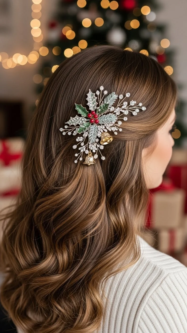 Holly-inspired clips bring a holiday theme without being too bold. Wave your hair lightly, then clip back each side. The clips keep hair off your face during meals and gatherings. You can find cute holly designs for cheap. If your hair is shorter, use miniature clips that grip better. Easy, gentle, and perfect for festive photos.