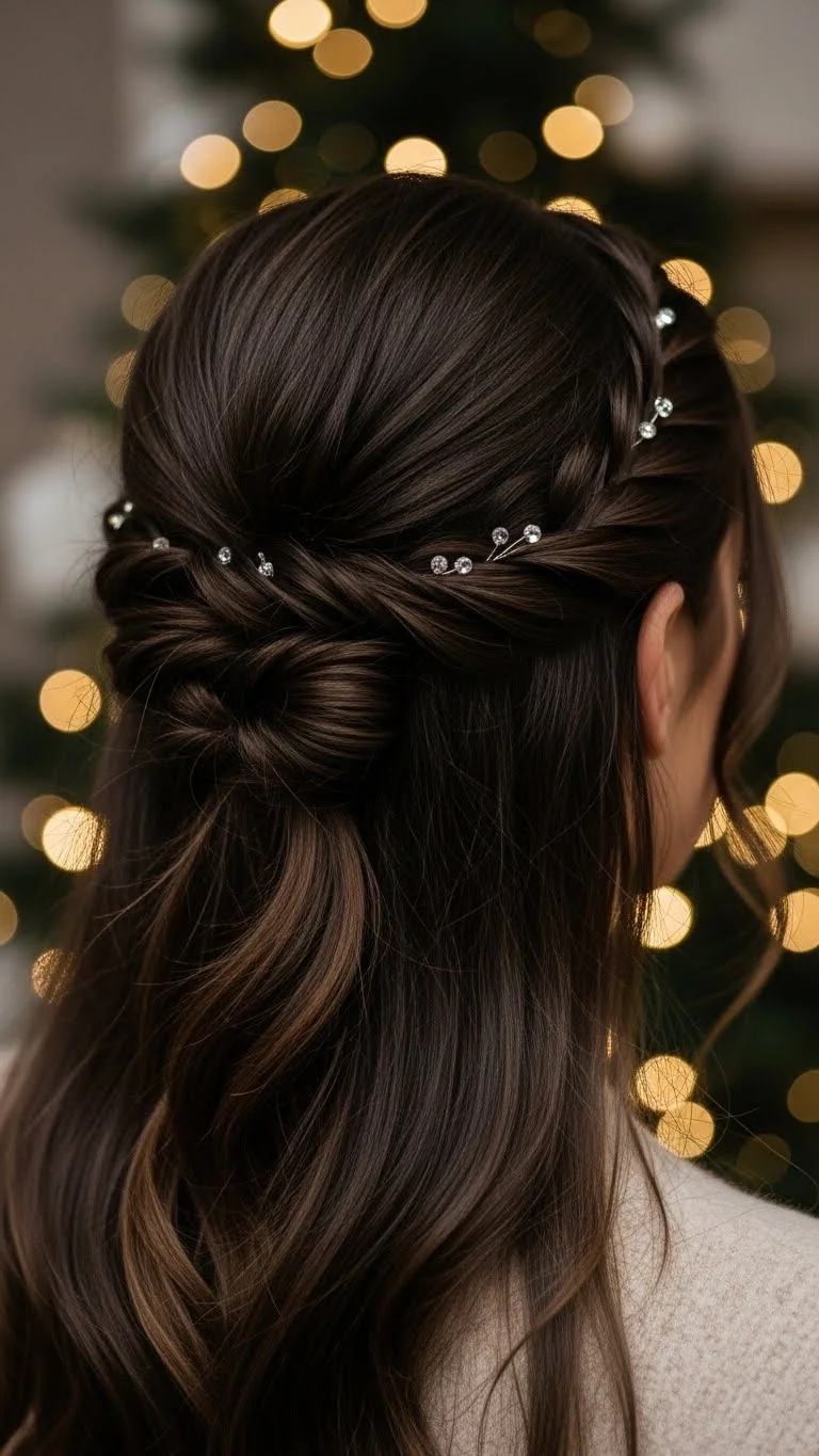 Twisting the top sections of your hair gives a clean half-up shape. Add tiny crystals or small rhinestone clips along the twists. You can find multipacks for a low cost. If your hair is short, twist smaller pieces so they stay secure. A little texture spray helps keep the twists from slipping. This style adds just the right amount of shine for holiday gatherings.