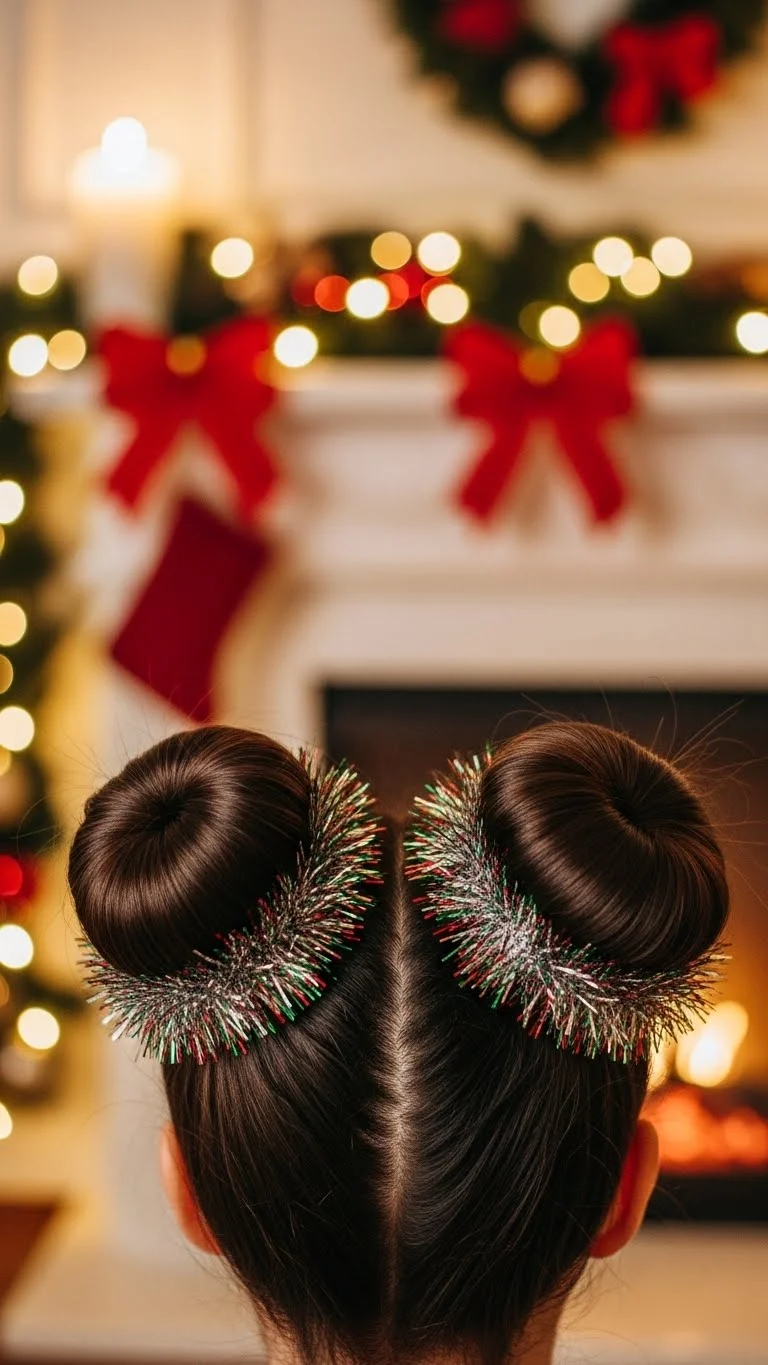 Mini space buns feel fun and festive. Part your hair down the middle and twist two small buns. Add thin tinsel strands by clipping them under each bun. You can buy tinsel packs for a few coins. If your hair is short, create tiny buns or even faux buns using clips. This style suits parties, photos, and playful outfits.