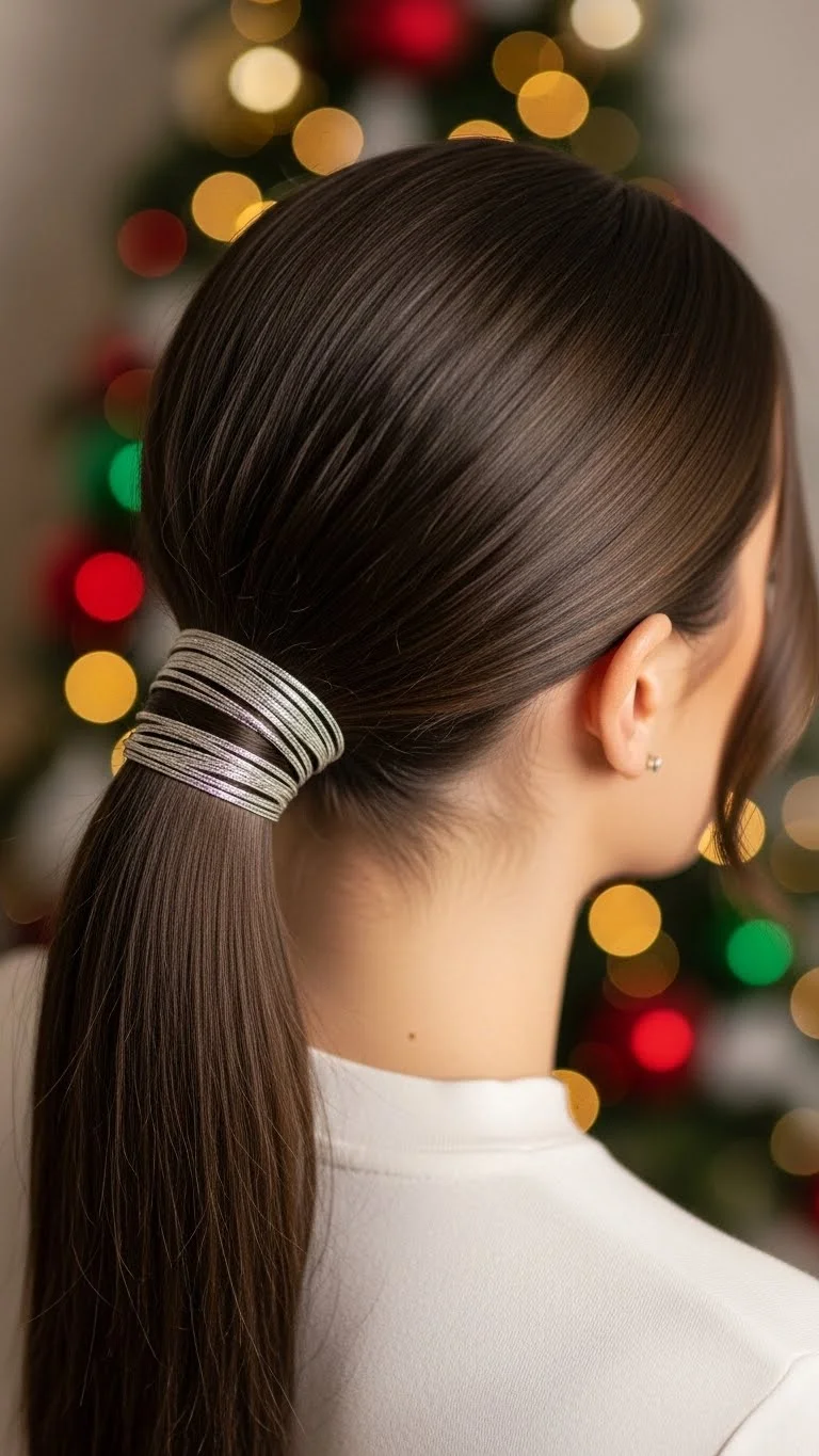 Wrap metallic thread around a simple low pony to add shine. Metallic thread is inexpensive and sold in craft stores. Keep the pony smooth with a small amount of serum. If your hair is short, wrap the thread around a half-up pony instead. The finish looks clean and eye-catching without extra work.