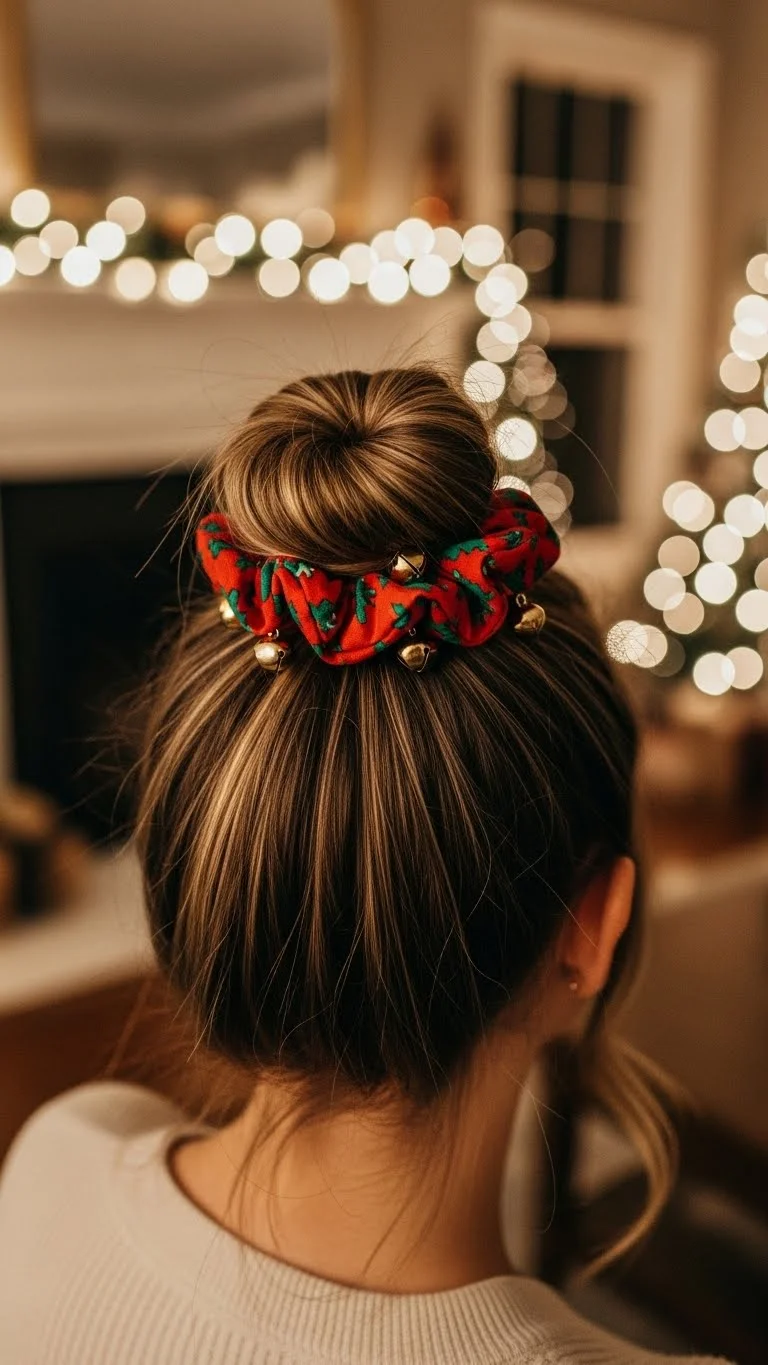 A messy top knot is perfect for busy days filled with errands and gatherings. Scoop your hair into a high ponytail, twist it, and wrap it loosely. You don’t need it neat—loose strands add charm. A holiday-pattern scrunchie hides imperfections and adds color. These scrunchies are inexpensive and easy to find in multi-packs. If your hair is shorter, use a small claw clip under the bun to help it stay up. A bit of dry shampoo at the roots gives gentle lift and keeps the bun from slipping. Add small gold pins around the base for extra sparkle. This style works with both straight and curly textures. It’s practical, quick, and gives that casual holiday feel without extra effort.