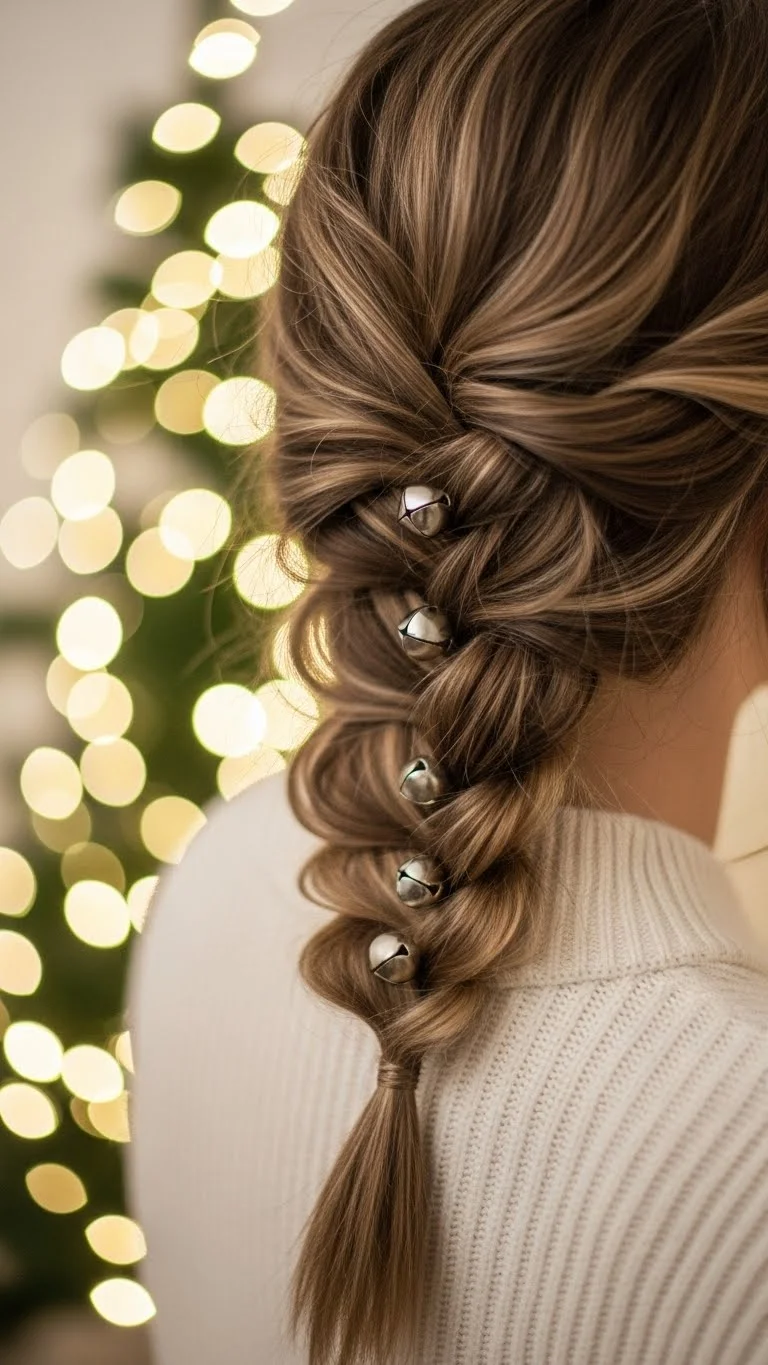 A loose side braid becomes festive with tiny bells tied to the ends. Choose small, lightweight ones so they don’t pull. Secure the braid with a thin elastic, then thread the bells onto a short ribbon and tie it around the bottom. You can find bell packs at craft stores for just a few coins. Keep the braid loose for a relaxed shape. If your hair is short, braid only the front section and clip it to the side with a small bell accessory. This style brings a fun, playful holiday feel, especially at family gatherings or kids’ events. It’s simple, affordable, and takes only a minute or two.