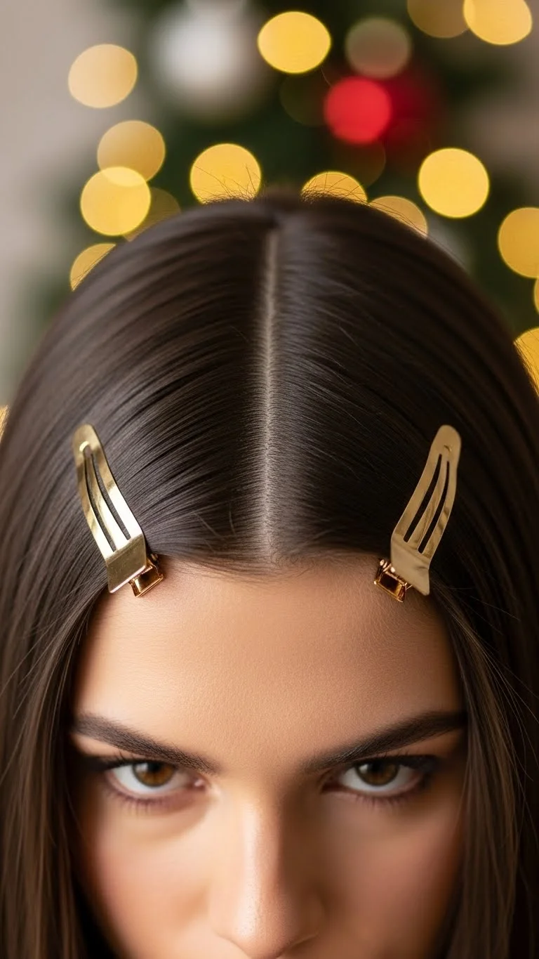 A sleek middle part is easy to create and pairs well with gold clips. Start with straightened or naturally straight hair. Apply a tiny bit of serum to keep it smooth. Add two matching gold clips near your temples. You can grab a set of four or six for a very low price. If your hair is wavy, flatten only the top portion and let the rest stay natural. This keeps the look soft. For shorter hair, place the clips slightly higher to avoid slipping. This style feels festive without trying hard and works nicely with bold holiday makeup or bright outfits. Quick, simple, and polished.