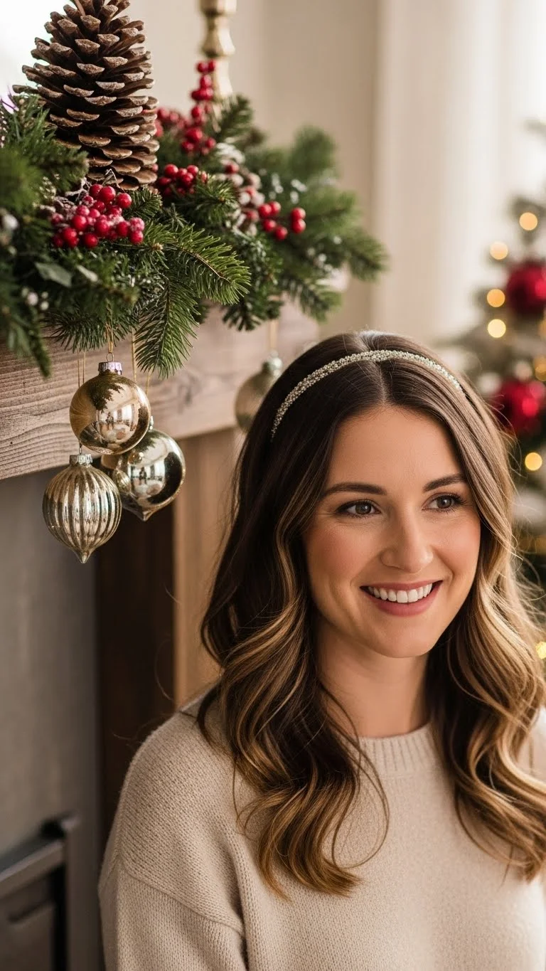 Loose waves paired with a glitter headband give a relaxed yet shiny touch. Wave a few sections with a curling wand, leaving the ends straight for a modern shape. Slide on a glitter headband—silver or gold works best for holiday photos. You can find inexpensive packs online. If your headbands slip, lightly tease the crown before placing it. For extra comfort, choose soft-lined bands that won’t pinch. This style works for almost every length, even bobs. Fast, pretty, and easy to recreate.