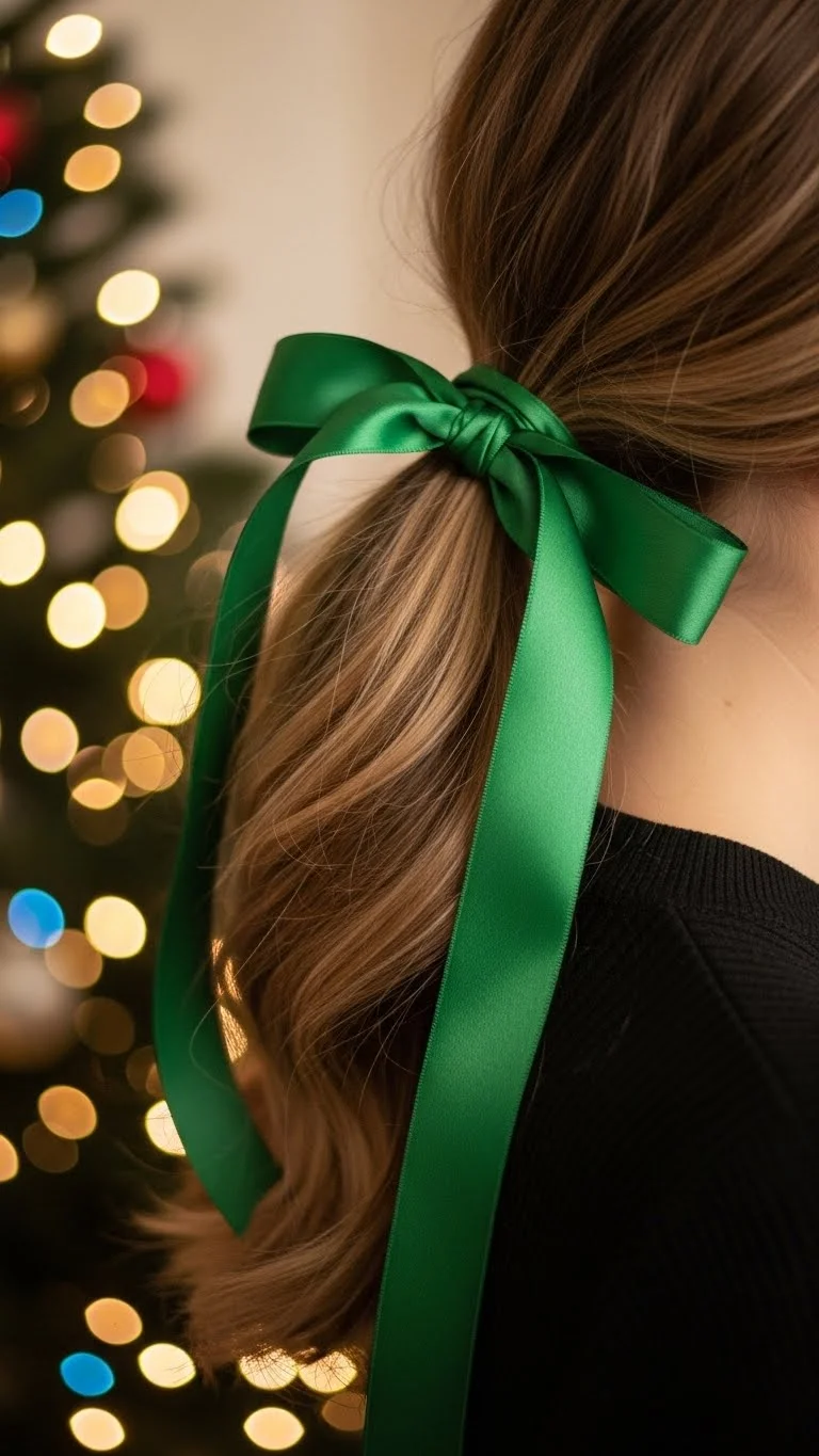 A low side ponytail brings a sweet holiday feel. Brush your hair to one side and secure it with an elastic. Tie a green satin ribbon over the elastic for color. Curl the ends if you want a softer look. If your hair is short, gather only the bottom layer and clip the rest back with small pins. Satin ribbons are cheap and easy to match with your outfit. You can make the ribbon longer for a dramatic shape or keep it short for a neat tie. This style works for all textures and takes less than three minutes.