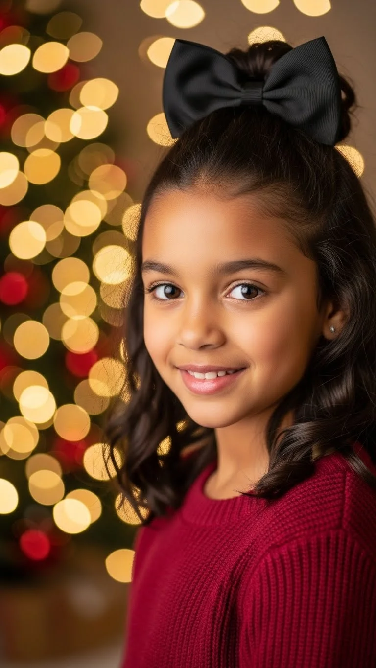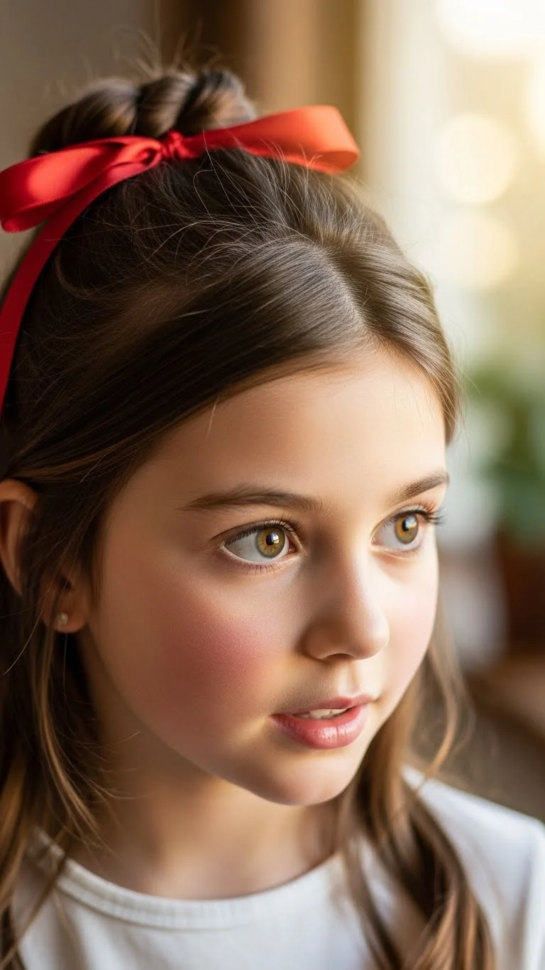A top knot feels fun and tidy. Pull the hair high and twist into a knot. Place a velvet bow at the back. Choose smaller bows for young kids so they don’t slide. For older girls, a larger bow adds flair. Use a soft elastic to avoid pulling. This style stays put all day. You can also add a tiny braid on one side before forming the knot to add texture.