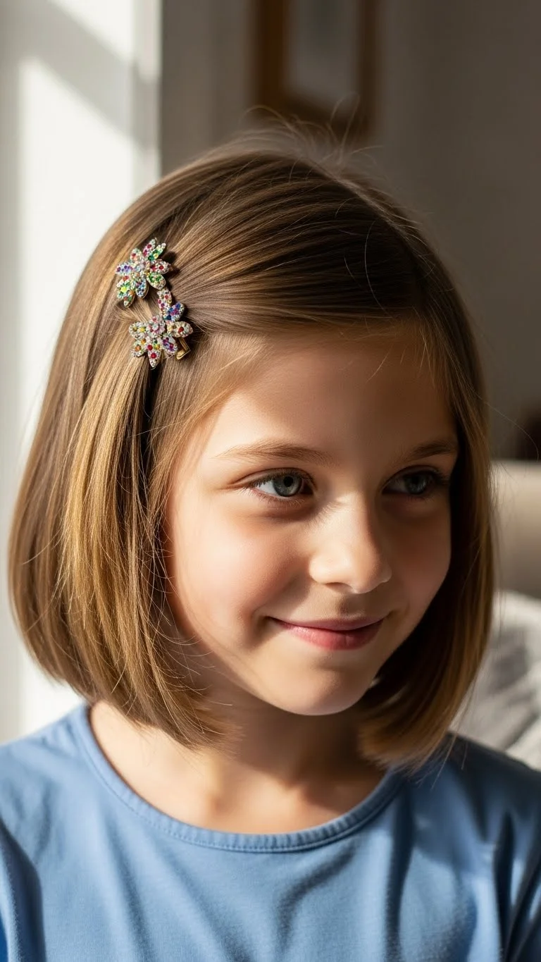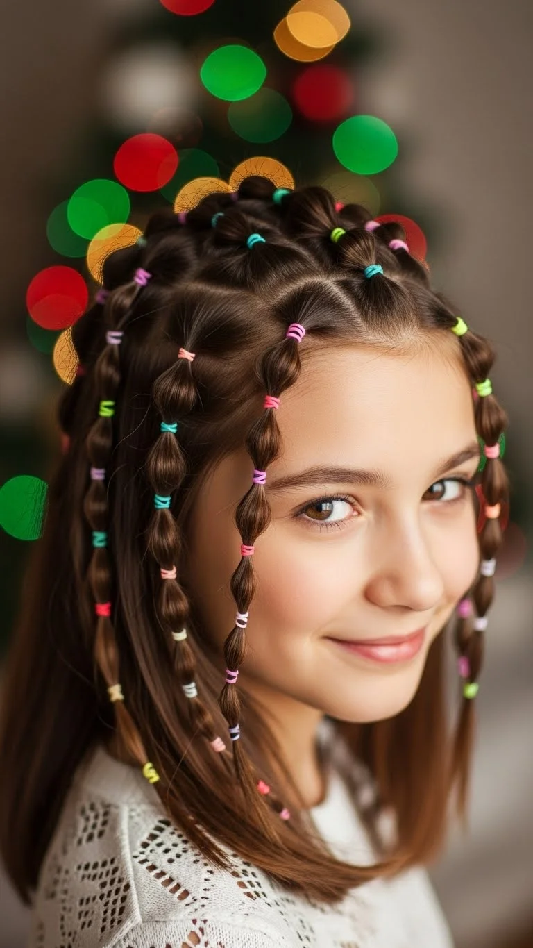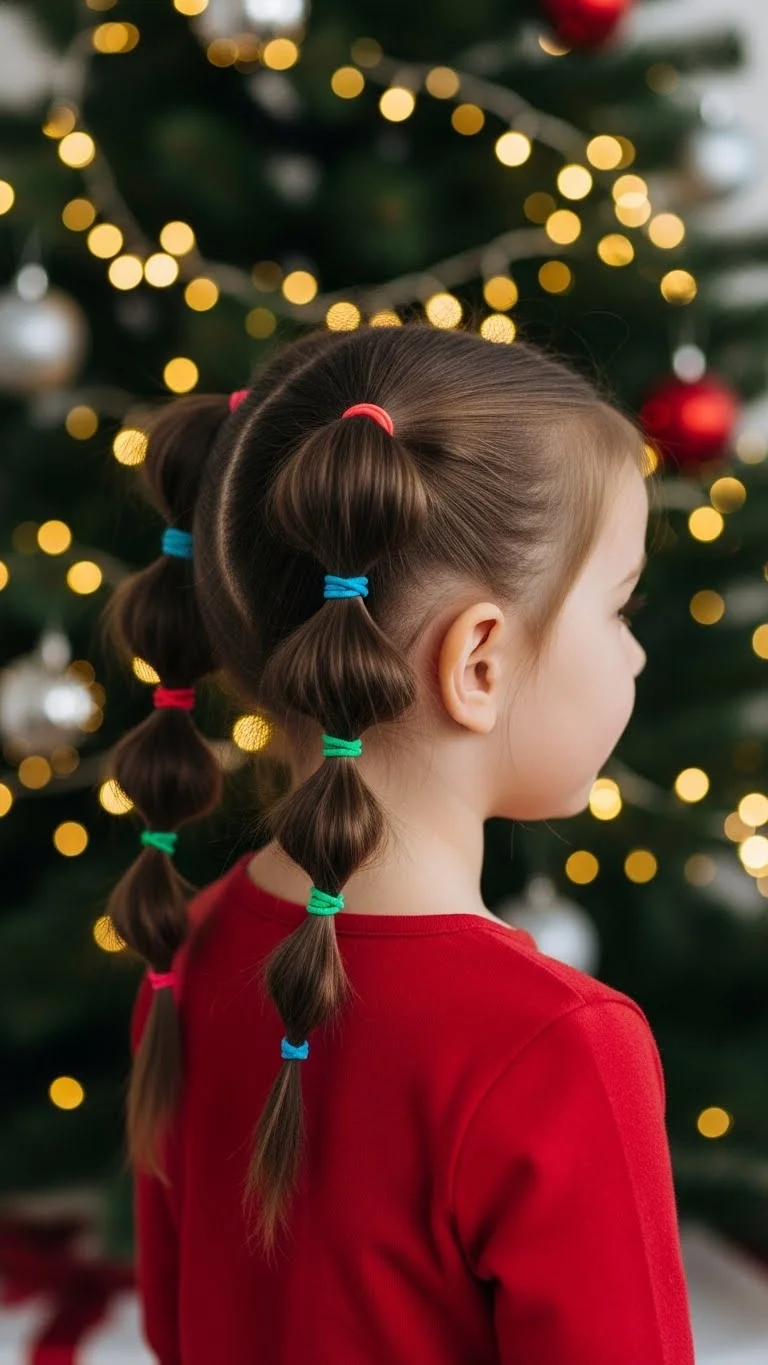 Bubble pigtails add a fun twist to a classic look. Tie two low pigtails. Add small elastics every inch down each tail. Gently pull each section to create rounded “bubbles.” Use matching elastics or mix colors for a playful look. If the child has fine hair, keep the elastics loose for comfort. This style stays neat during active play. You can add small holiday clips near the top elastic for extra charm. Bubbles also help shorter layers stay contained.