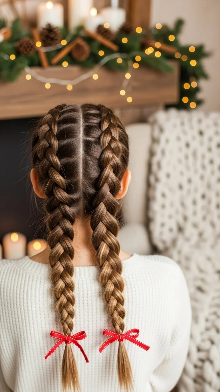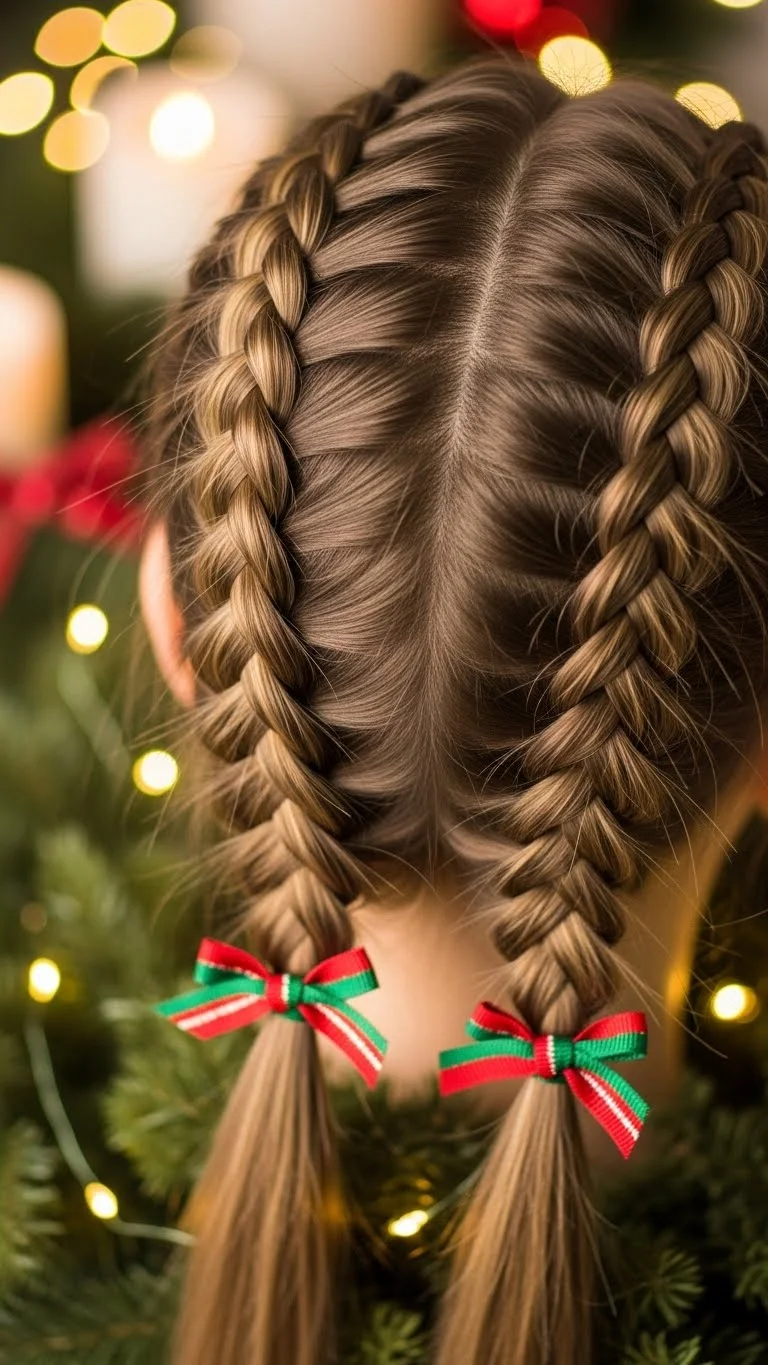 Two French braids feel tidy and playful. Braid from the front toward the nape. Tie each braid with ribbon. This holds hair well during school activities. If the child dislikes tight styles, keep the braid loose. For thick hair, start braiding slightly lower. Ribbons add just enough holiday charm without spending much.