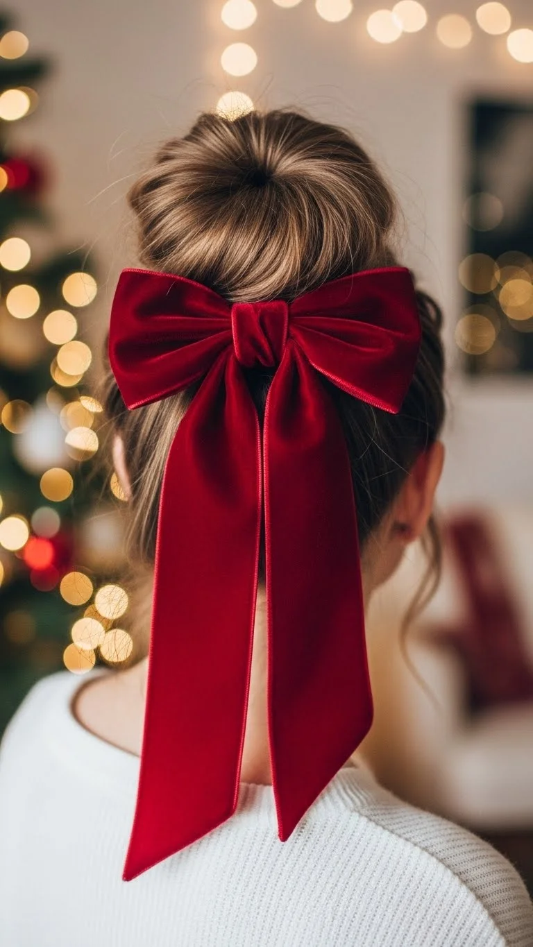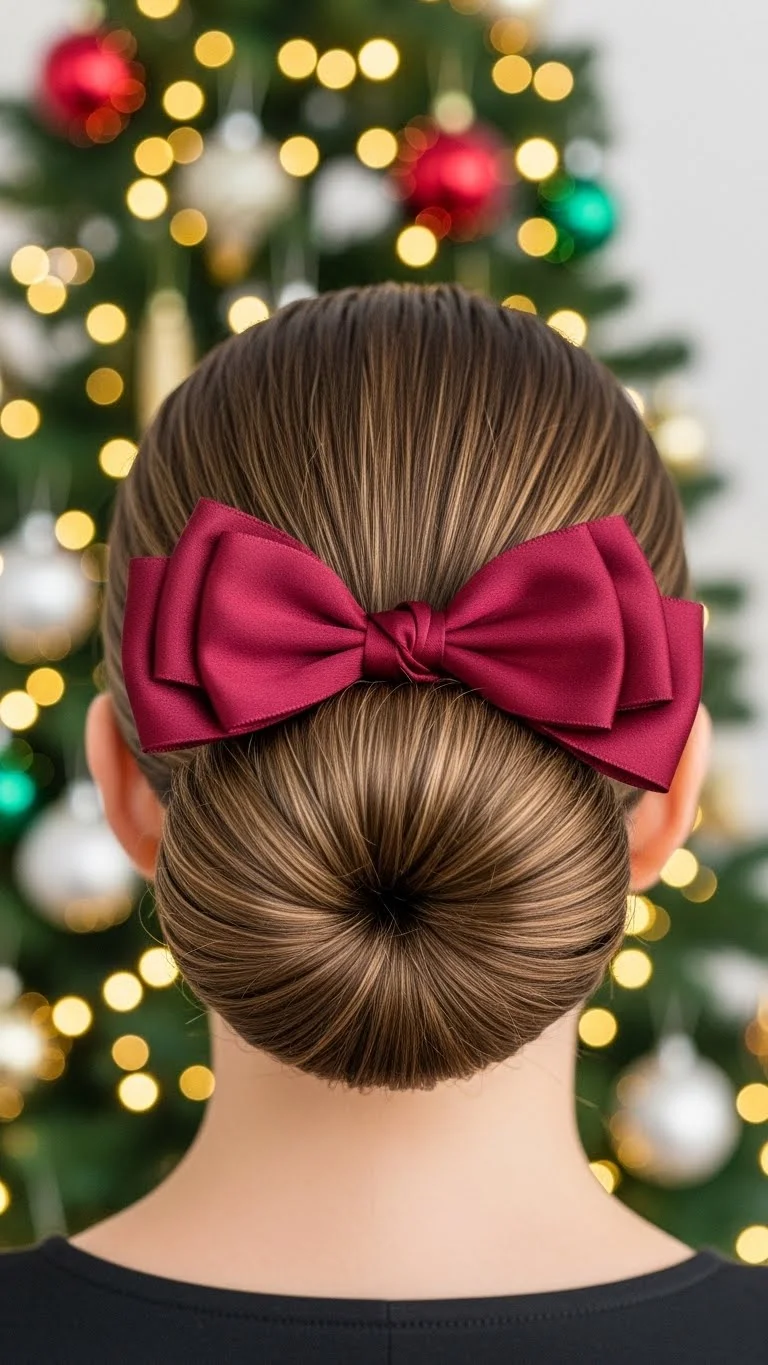 Brush hair into a neat low bun. Tie a satin bow at the base. Use a small amount of water to smooth flyaways. This simple style looks polished without extra cost. Choose bow colors like gold or red for a seasonal touch. It’s comfortable for long events and works for all ages.