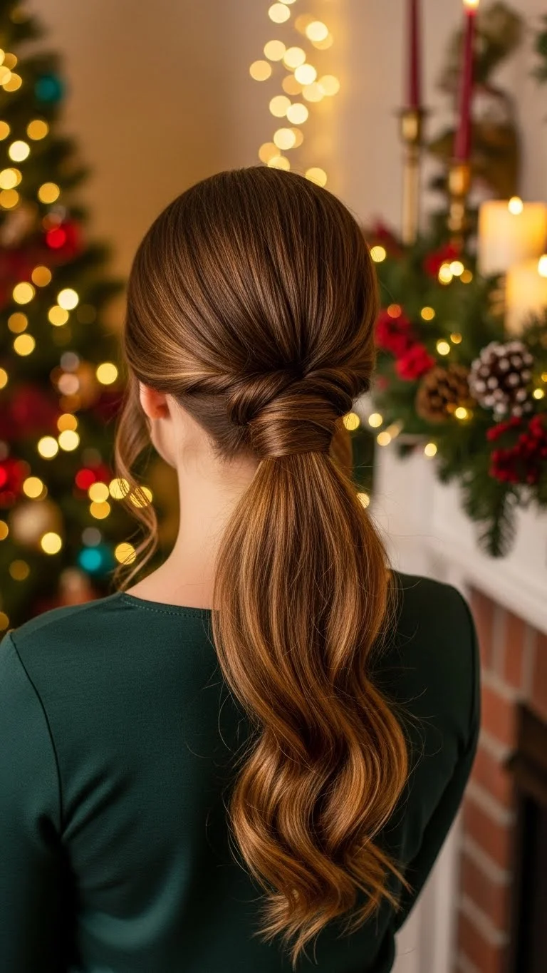 A low side ponytail looks simple and sweet. Brush hair to one side and tie with a glittery elastic. Choose elastics that feel soft and gentle. For wavy hair, leave the pony loose. For straight hair, wrap a small section around the base for a cleaner look. This style takes less than two minutes. Add a holiday pin near the base for extra charm. It works nicely for school events and at-home celebrations.