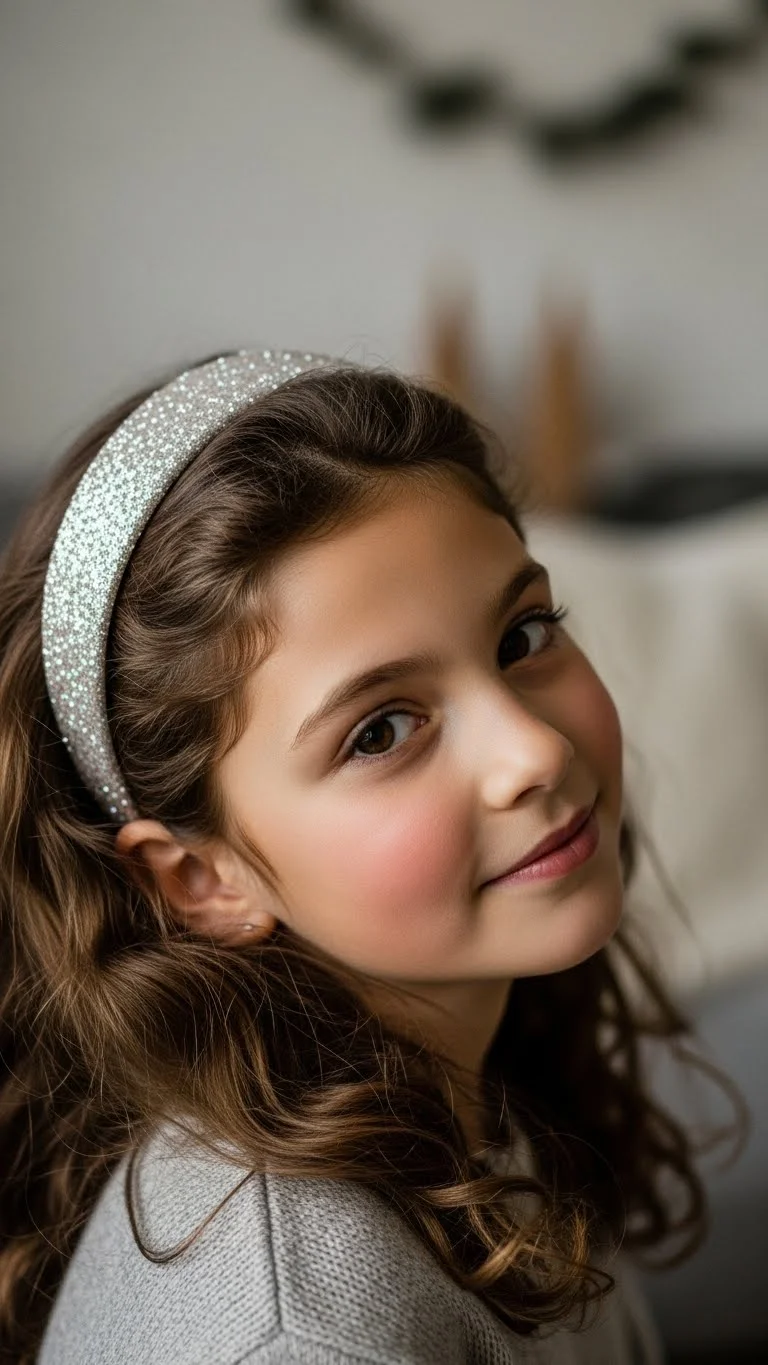 Loose curls feel soft and comfortable. Use heatless curls by wrapping hair around a scarf overnight. In the morning, place a sparkly headband a few inches back from the hairline. Pick a lightweight band so it doesn’t press too hard. This style looks pretty with minimal effort. It fits all ages and works well for family portraits.