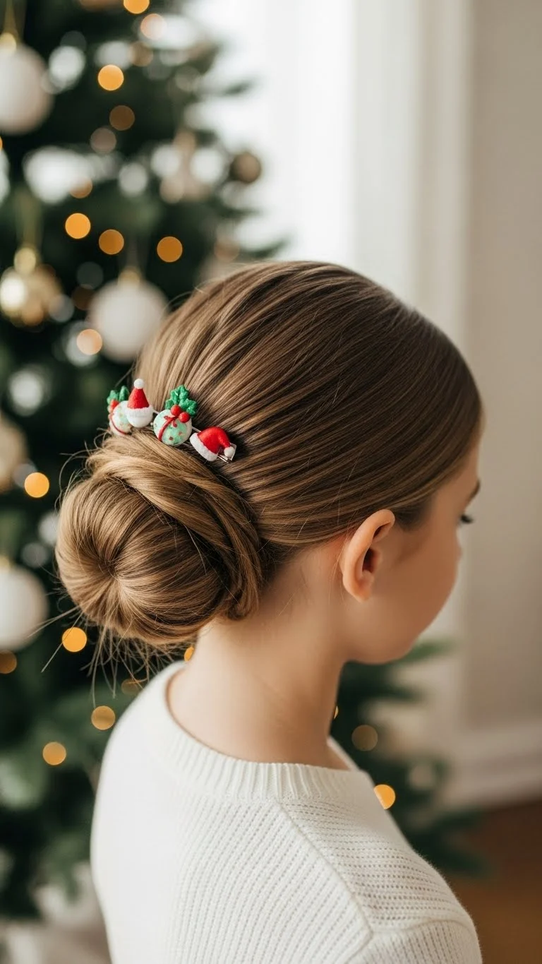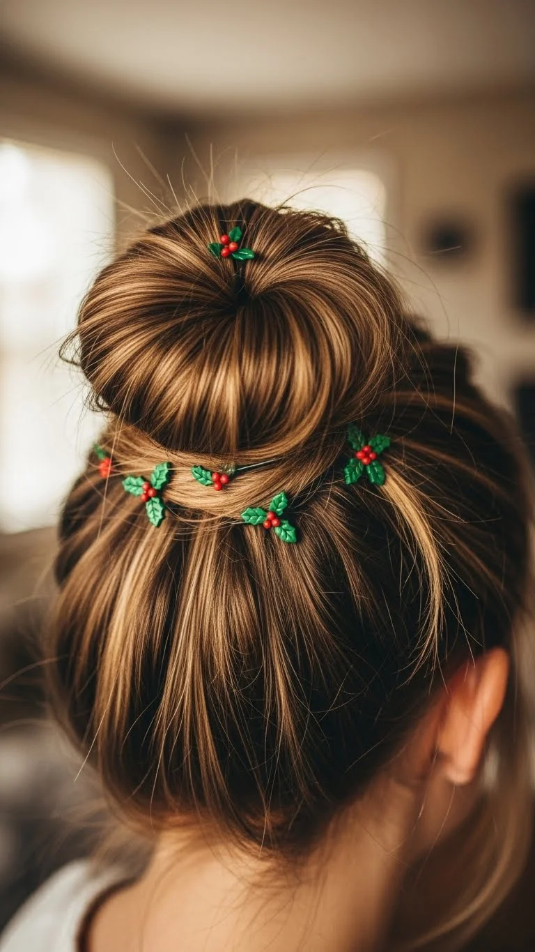 A messy bun looks playful and effortless. Pull the hair into a loose ponytail. Twist it once and secure loosely. Let a few strands fall around the face. Add two or three holly-inspired pins for a gentle holiday touch. These pins often come in inexpensive sets. If they feel heavy, place just one on the side. This style works well for dance recitals or family gatherings. For thicker hair, use a larger elastic to hold the bun. For fine hair, create a small bun and fluff it with fingers to add volume.