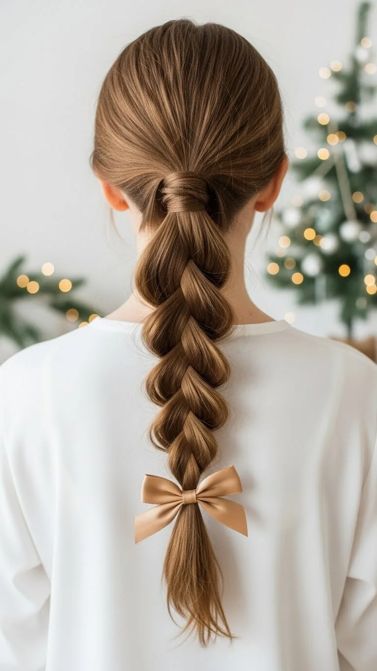 Start with a basic ponytail. Take two sections from the front and twist them back, crossing them over the ponytail base. Pin them underneath. This gives a holiday-ready look without extra tools. If the hair is short, twist thin sections for comfort. Add a small ribbon at the base for color. This style works well for school photos or casual gatherings.
