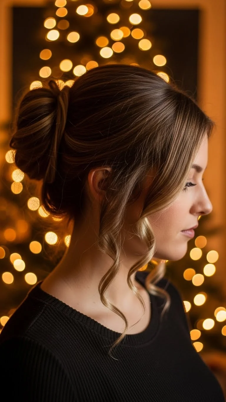 Brush hair to one side and form a bun just behind the ear. Curl two small front strands using a heatless twist method. This gives a relaxed look perfect for holiday gatherings. Add a tiny clip above the bun for color.