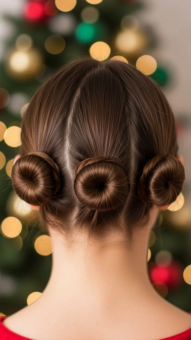 Divide the hair into three sections. Twist each into a tiny bun. Secure gently. This style feels fun for kids and teens. Add small festive clips near each bun for color. Works even on shoulder-length hair.