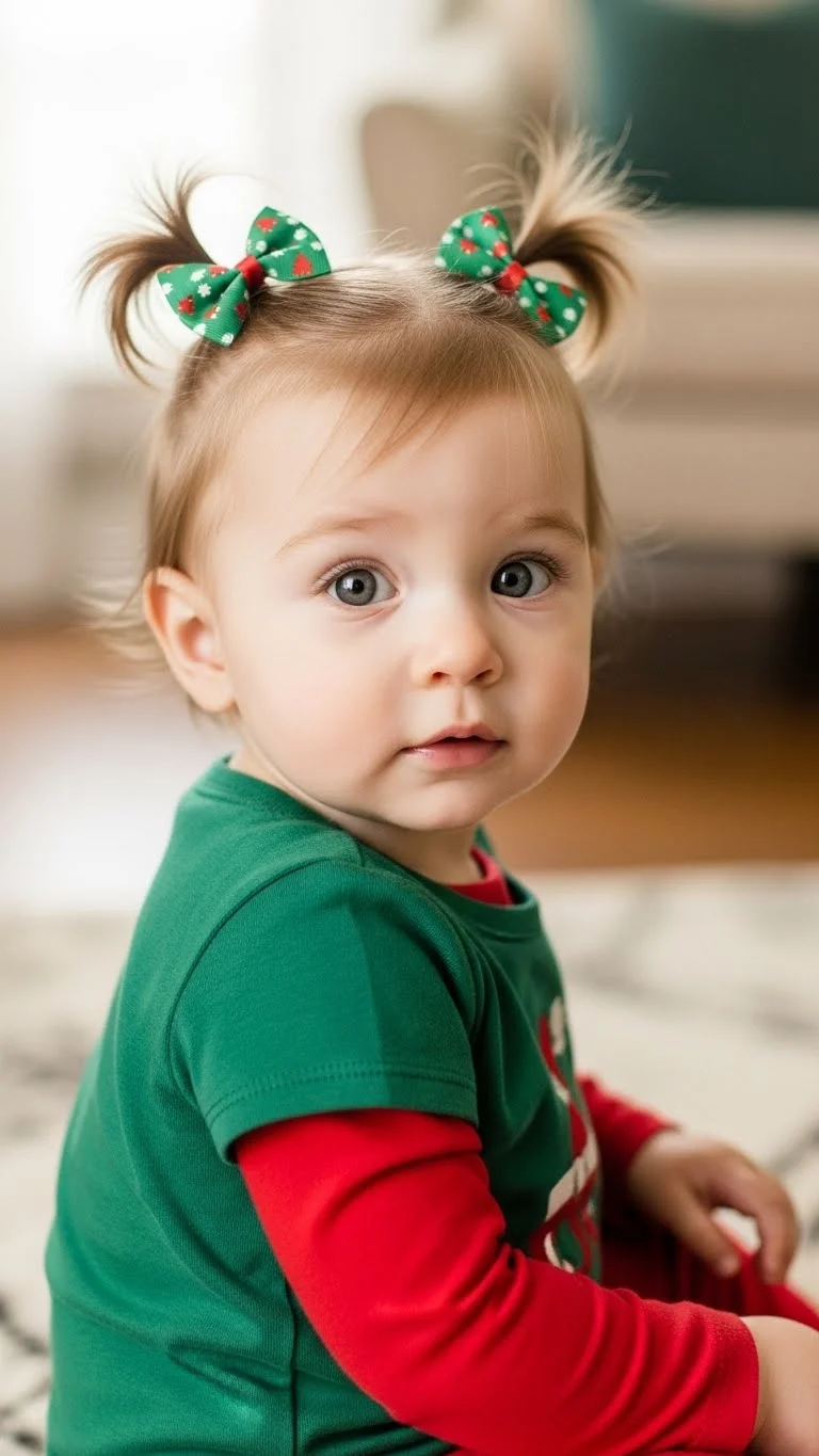 Pigtails are simple and stay put during play. Part the hair down the middle and tie each side with a gentle elastic. Add tiny bows for a holiday look. Choose soft fabric bows so they don’t pull. For thin hair, make the pigtails lower for better grip. Wipe fingers with a little water and smooth any bumps while tying. Keep spare bows in your bag for outings. This style works well for daycare parties and family photos. If the child moves a lot, double-loop the elastic for security. Choose bow colors that match the outfit for easy coordination.