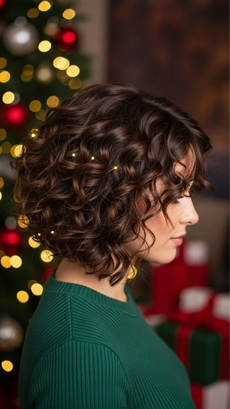 A curly bob shines during the holidays. Use a curling wand or rollers to shape loose curls. Scrunch lightly with a curl cream. Keep the curls soft, not crunchy. This style suits short hair perfectly. Add a clip on one side to bring balance. You don’t need fancy accessories; even a simple metallic pin works well. It frames the face nicely and pairs with bold makeup. If your curls fall flat, set them with a gentle hairspray. This look is quick and perfect for both formal and relaxed gatherings.