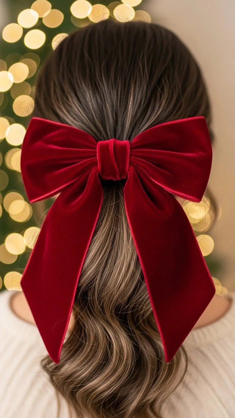 A low ponytail becomes festive with a velvet bow. Brush hair back smoothly. Tie it low at the nape. Add the bow on top of the elastic. Choose deep colors like burgundy or forest green. Velvet adds a holiday feel without extra effort. If you want more body, curl the ponytail lightly. Smooth the top with a small amount of gel or cream. This works well on medium and long hair. It’s perfect for simple outfits. A velvet bow can be reused all season, making it budget-friendly.
