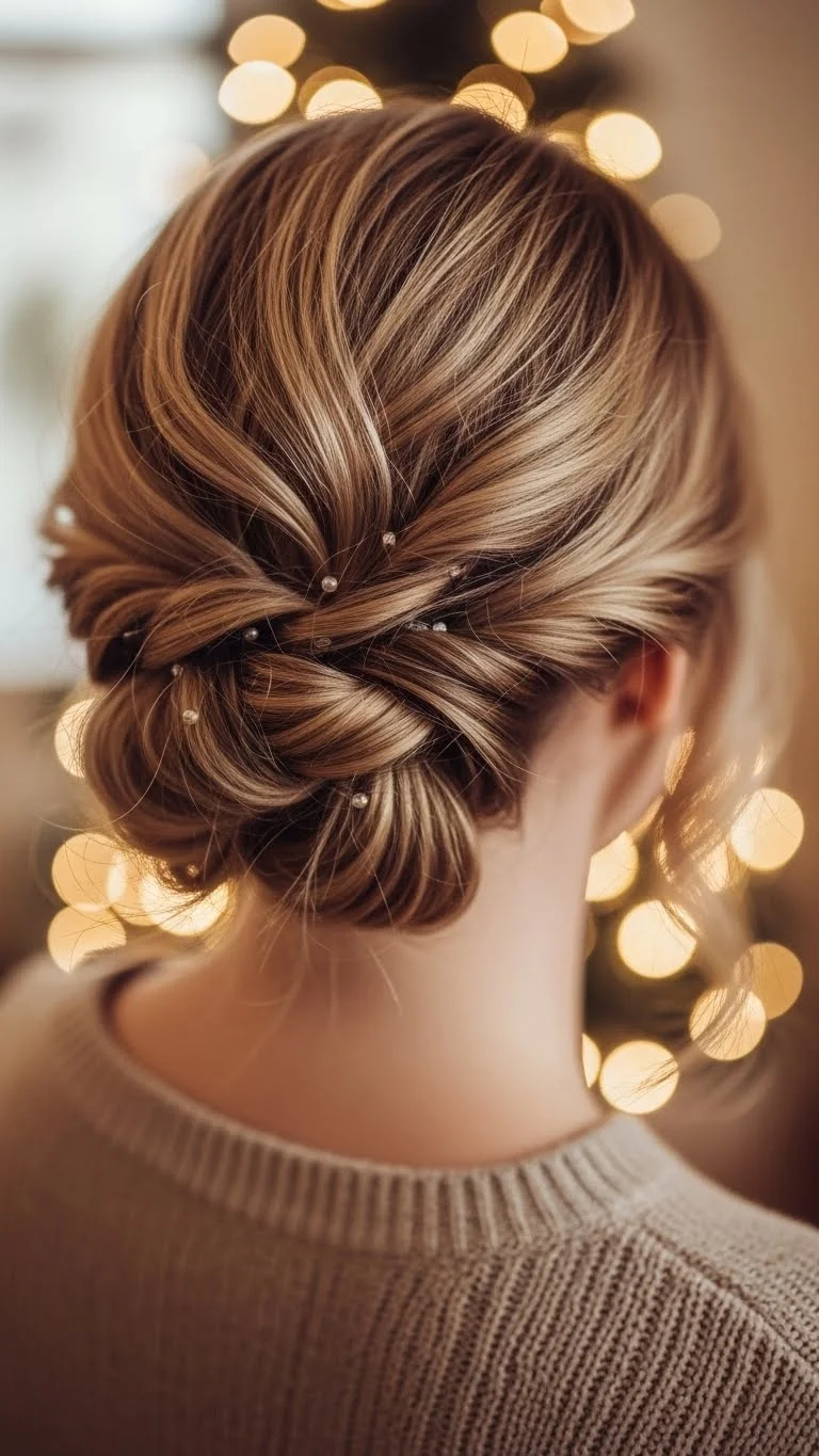 This bun looks soft and effortless. Pull hair back loosely and twist it into a bun. Leave a few strands out near your face and curl them. Add a simple clip or decorative pin. This works well for dinners or holiday photos. It’s easy to redo if it gets messy. Use inexpensive pins to secure it. A light hairspray keeps it from falling. It’s great for medium and long hair.