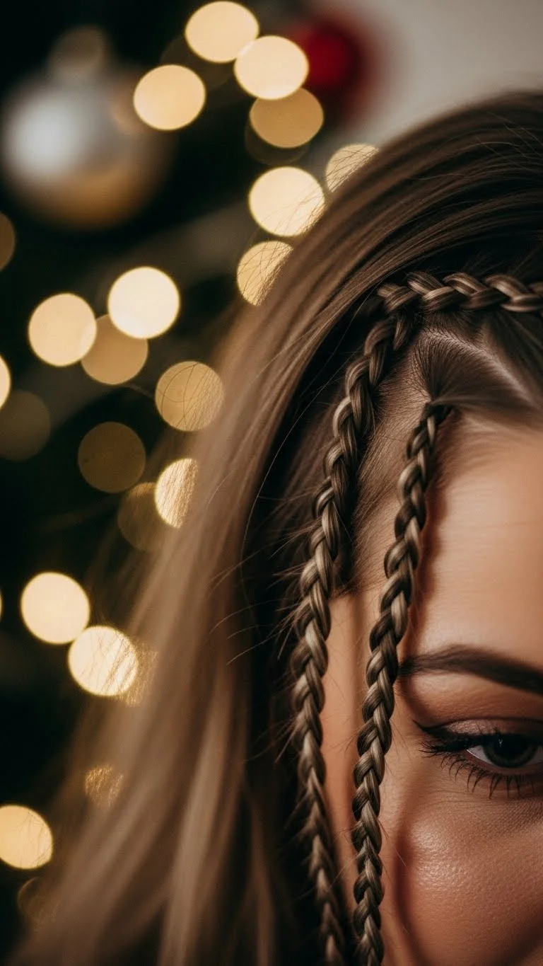 A halo braid looks festive without being complicated. Create two braids on each side and wrap them across your head. Pin them securely behind your ears. Pull the braid edges slightly to make it look thicker. You can tuck tiny faux berries or greenery pieces into the braid for a Christmas look. They cost very little and add charm. This style works even on medium-length hair. It stays in place for long events and photos well from all angles. If your braids slip, spray them lightly before pinning. A halo braid looks lovely with turtlenecks or sparkly dresses.