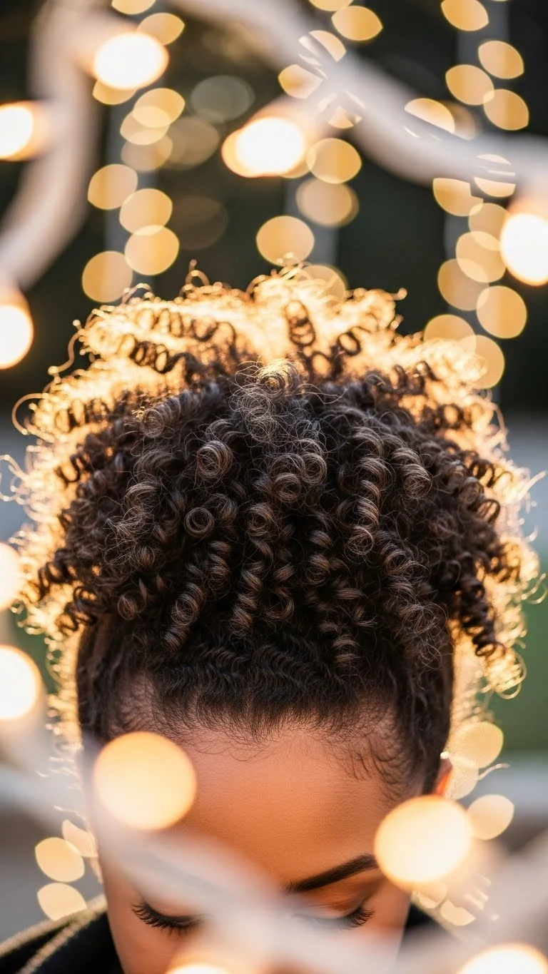 A high puff is perfect for natural curls. Gather your hair at the top and secure with a soft band. Fluff the curls gently. Add a headband or ribbon for holiday charm. This style is quick and protective. If your edges need smoothing, use a little gel and a brush. It’s comfortable and great for long events. You don’t need a lot of products—just curl cream and water. This style keeps curls full and vibrant for the entire night.