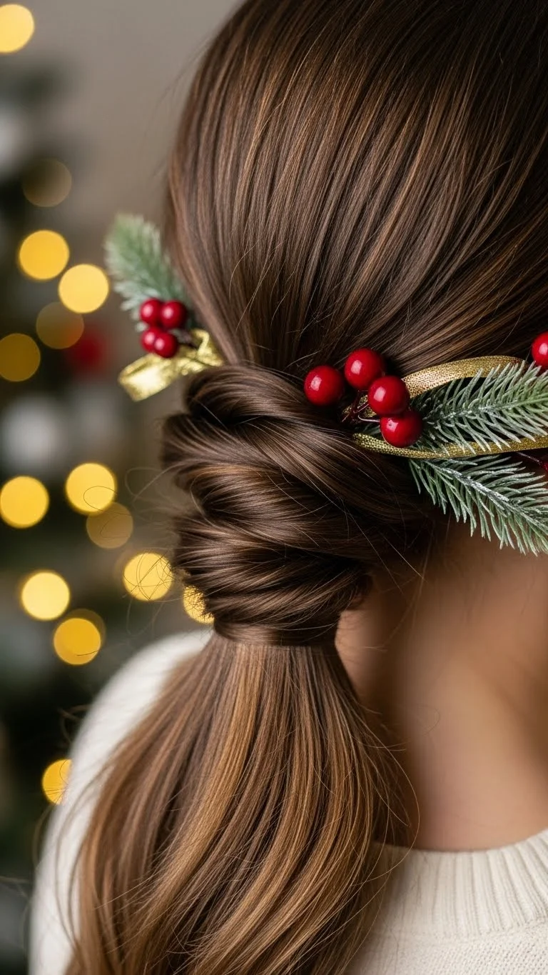 A low twisted pony adds a gentle twist to a simple style. Divide your hair into two sections above the ponytail, then flip it through once. It creates a pretty detail without much effort. Add a clip or small bow. It works on straight or wavy hair. If you want more volume, curl the ends. This hairstyle is perfect for casual or formal holiday gatherings. The best part is that it takes less than five minutes.