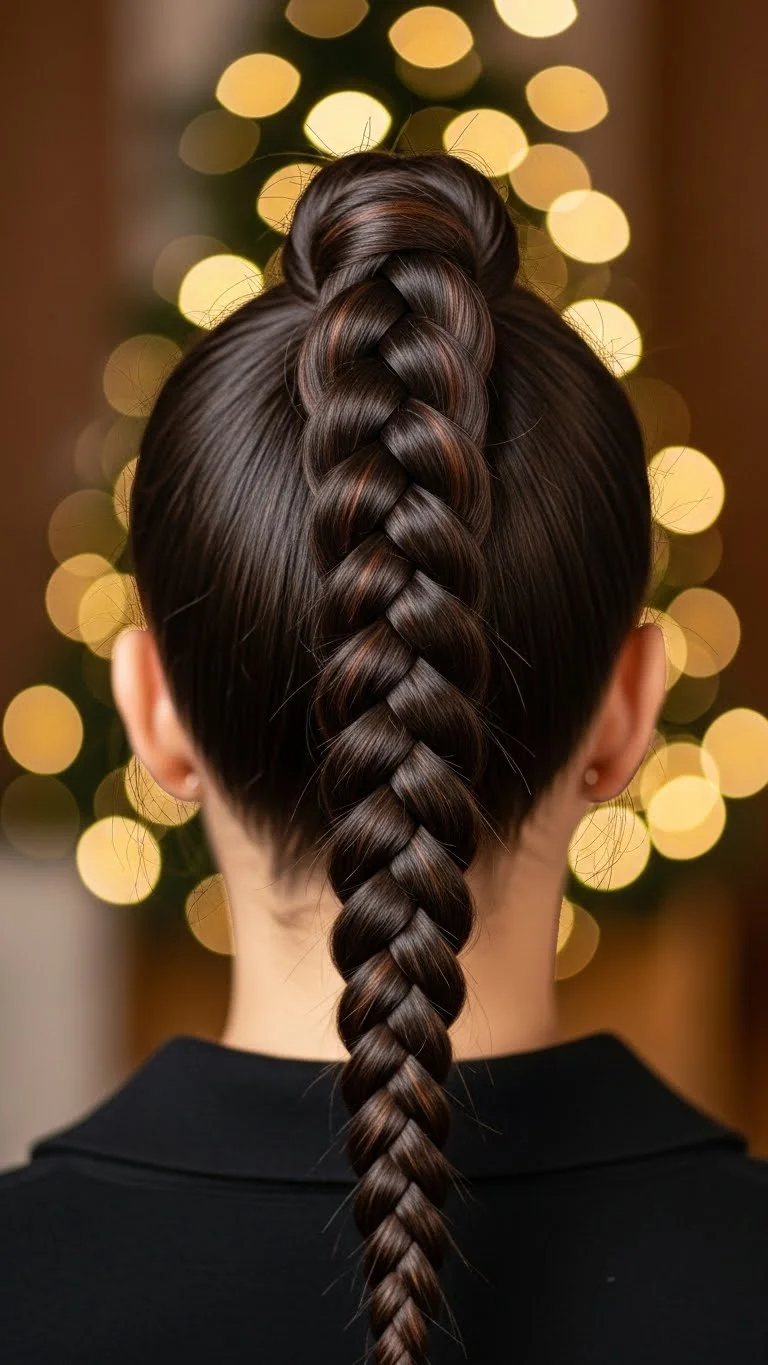 Start with a sleek ponytail. Smooth the top with a dab of gel. Braid the ponytail to the ends. Tie with a small elastic. Add a ribbon or clip at the base for a festive touch. This style stays neat all night. It’s practical and stylish. If you want more length, use a clip-in ponytail before braiding. You can find low-cost options online. This hairstyle works well with strong makeup looks or bold outfits.