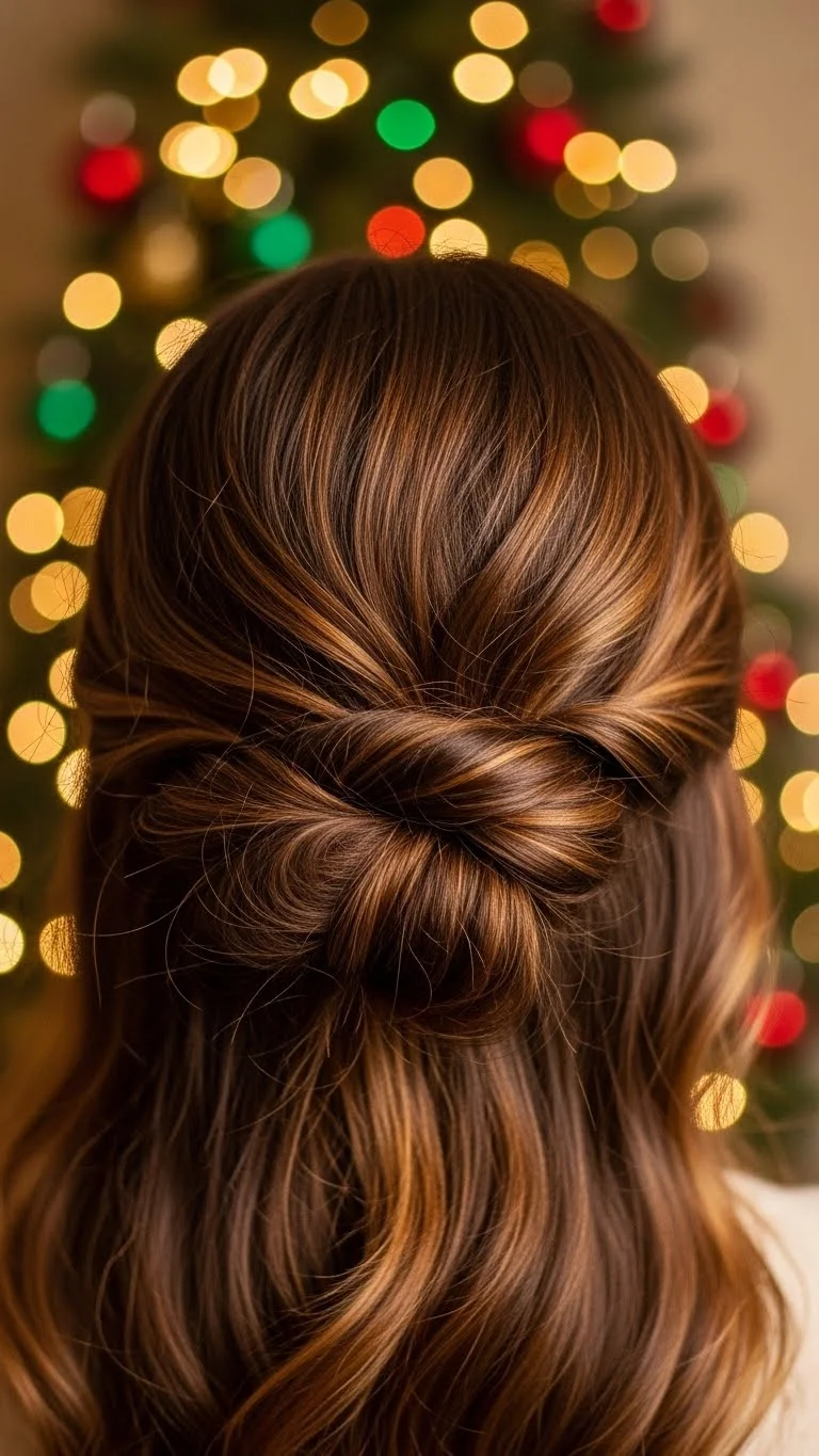 Create three small twists along the top of your head. Pin them together for a sweet half-up look. It adds texture without much effort. Curl the bottom for softness. This gives a layered effect that looks good from all angles. For a low-cost option, use simple pins and add small rhinestones. This style works well if you want hair off your face but still down. It holds up well during long holiday gatherings.