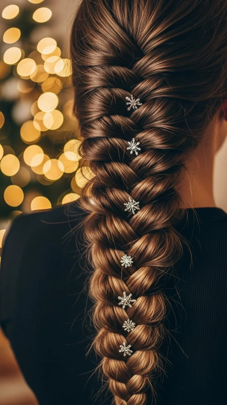 A classic French braid becomes festive with a few sparkle clips. Braid from the top down, keeping sections tight. Add small clips along the braid for charm. You can find multipacks at low prices. This style works well if you’re moving around a lot because it stays secure. It keeps hair tidy but still stylish. If your braid feels too tight, loosen it slightly for a softer finish. Spray lightly for hold. This works great with sweaters and dresses. It’s practical and pretty for any holiday plan.