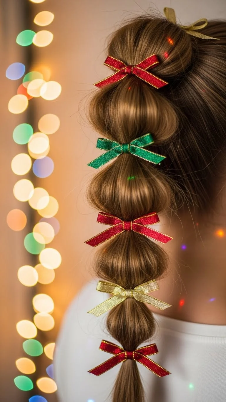 A bubble ponytail looks playful and festive. Start with a regular ponytail. Add small elastics every few inches. Gently pull the sections to create bubbles. Add ribbon around each elastic for a holiday touch. Use any ribbon you already have at home. It costs almost nothing. This style holds best on long hair, but medium lengths work too. Smooth flyaways with a little hair cream. It’s a fun choice for parties, dances, or casual dinners. It stays neat even through a busy night. If your hair is thin, tease each section slightly before forming bubbles.