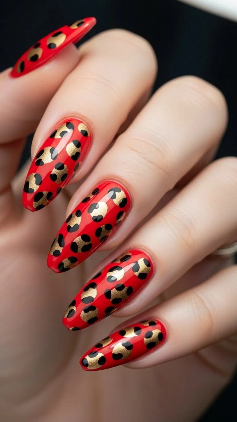 For those who want to show their “wild side,” leopard print on a red base is perfect. It is fierce and full of confidence. You can do this with a thin brush or a toothpick. Paint your nails red. Add random “C” shapes in black polish. Put a dot of gold or a darker red in the center of the black shapes. The beauty of leopard print is that it shouldn’t be perfect. Messy spots actually look more realistic. It is a fun DIY project that doesn’t require a steady hand. Use your oldest black polish for this; a thicker consistency actually helps the spots stay in place.