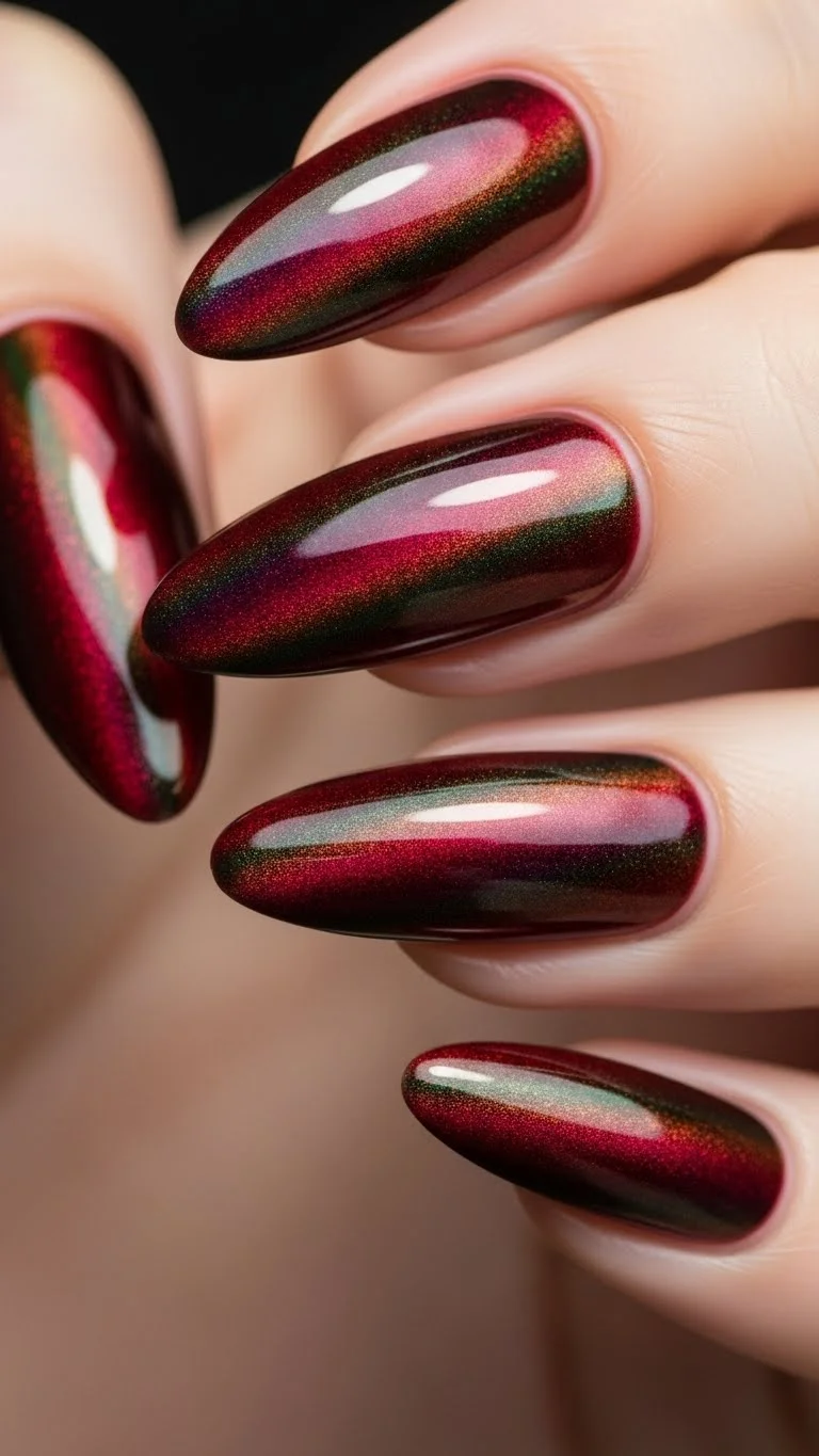 Magnetic polish creates a “velvet” look that seems to move when you turn your hand. It is a huge trend right now. You can buy magnetic red polish sets for a low price online. They come with a small magnet. You paint the nail and hold the magnet over it while the polish is wet. The metal particles in the paint react to the magnet, creating a shimmering line. It looks like a complex professional service. If you don’t want to buy the magnet, just use a red polish with a “shimmer” or “pearl” finish. It gives a similar soft, glowing effect that is very romantic.