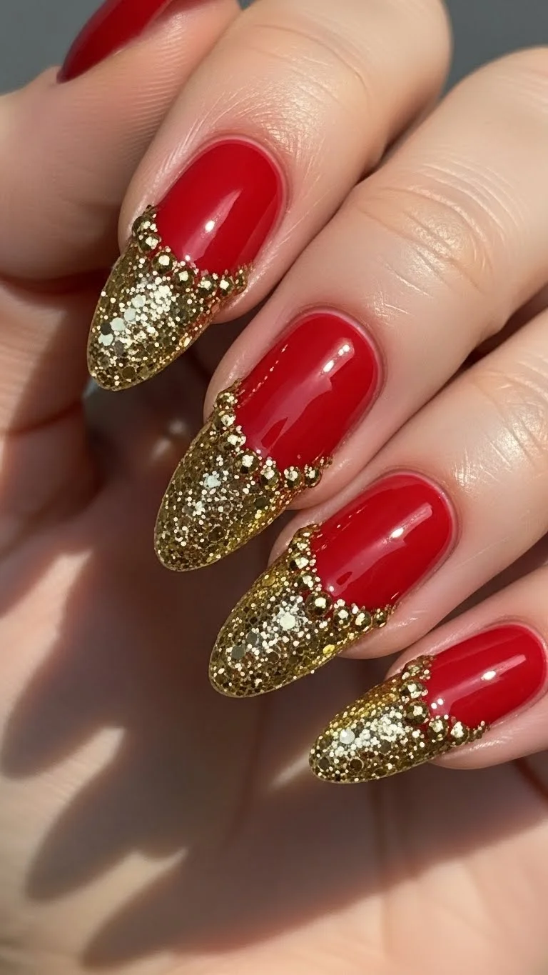 A “cuff” is the opposite of a French tip. You put the detail at the base of the nail. This is a great way to hide a manicure that is starting to grow out. If you have a gap between your red polish and your cuticle, fill it in with a thick glitter polish. It looks intentional and stylish. It saves you from having to do a full “fill-in” or a new manicure. This practical hack keeps your nails looking “fresh” for an extra week. Use a chunky glitter for the best “jewelry” effect.