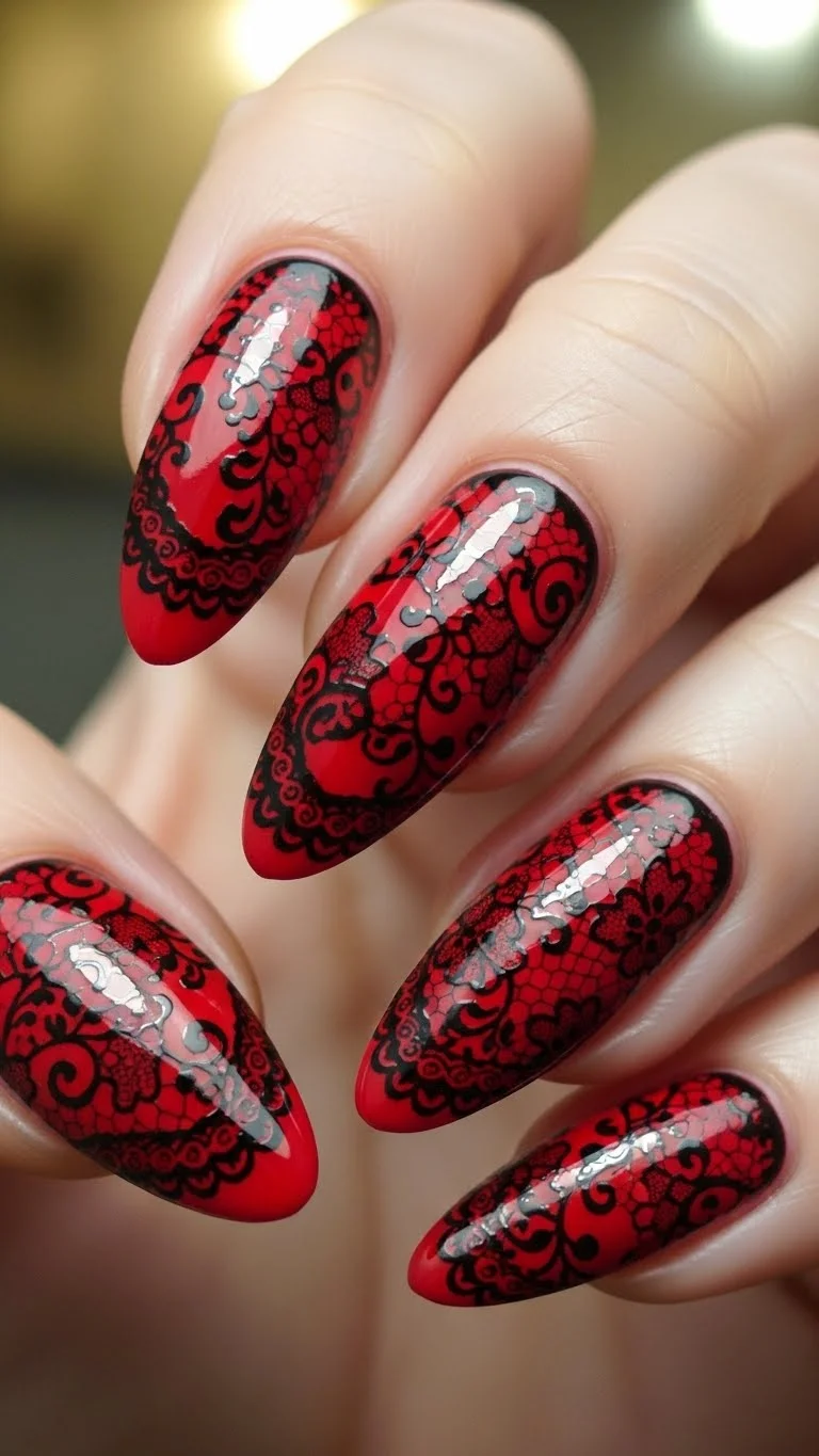 Lace is a classic romantic texture. You can get this look using nail stamping kits. These are affordable tools where you scrape polish over a metal plate and “stamp” the design onto your nail. If you don’t have a kit, you can actually use a small piece of real lace fabric. Hold it over your red nail and sponge black polish over it. When you lift the lace, the pattern stays behind. It is a very “DIY” way to get an intricate look. It adds a touch of “gothic romance” to your Valentine’s Day style.