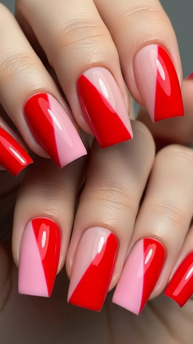 Red and pink used to be a fashion “no-no,” but now they are the ultimate duo. This color blocking is bold and confident. It shows you aren’t afraid to play with color. Use painter’s tape or Scotch tape to divide the nail. Paint one side red and let it dry. Cover that side with tape and paint the other side pink. Remove the tape slowly to see the clean line. This looks like a high-end salon design but only costs you the price of two bottles. Choose shades with the same “temperature”—either both bright or both muted—to make them look cohesive. It is a striking graphic look for a modern date night.