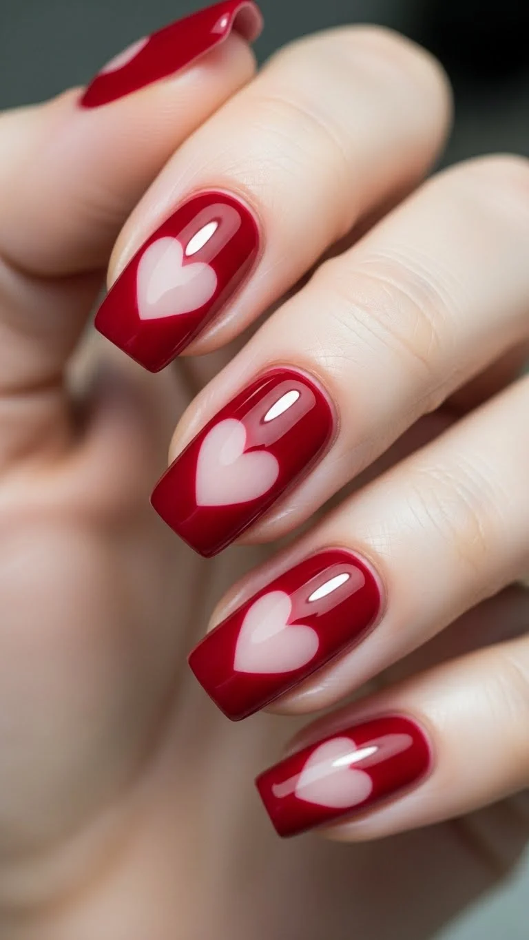 Negative space designs use your natural nail as part of the art. This looks very professional and “editorial.” To do this, cut a small heart out of a piece of tape. Stick the heart onto the center of your bare nail. Paint over the entire nail with red polish. While it is still wet, use tweezers to peel off the tape heart. You are left with a clear heart window surrounded by red. This style is great because as your nail grows out, the gap at the bottom is less noticeable. It saves you money by extending the life of your manicure. It is a smart and stylish choice.
