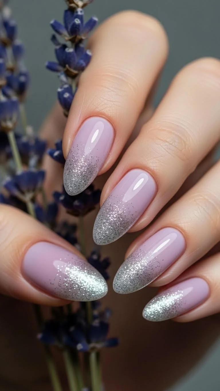 Lavender is a beautiful alternative to red. It feels calm and romantic. Add a silver glitter polish to the base of the nail. Swipe it upward to create a sparkle effect. This is a very forgiving design for beginners. If the lavender polish is streaky, the glitter will cover it up.