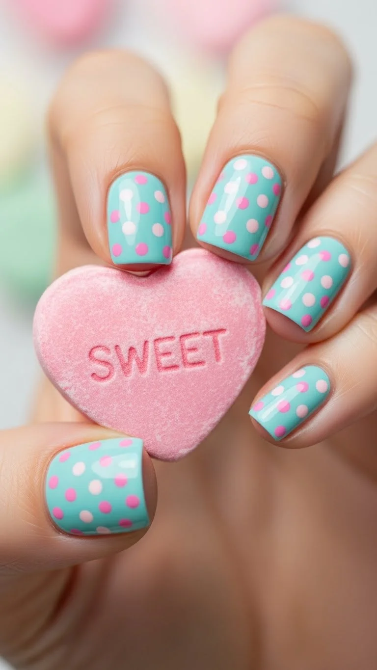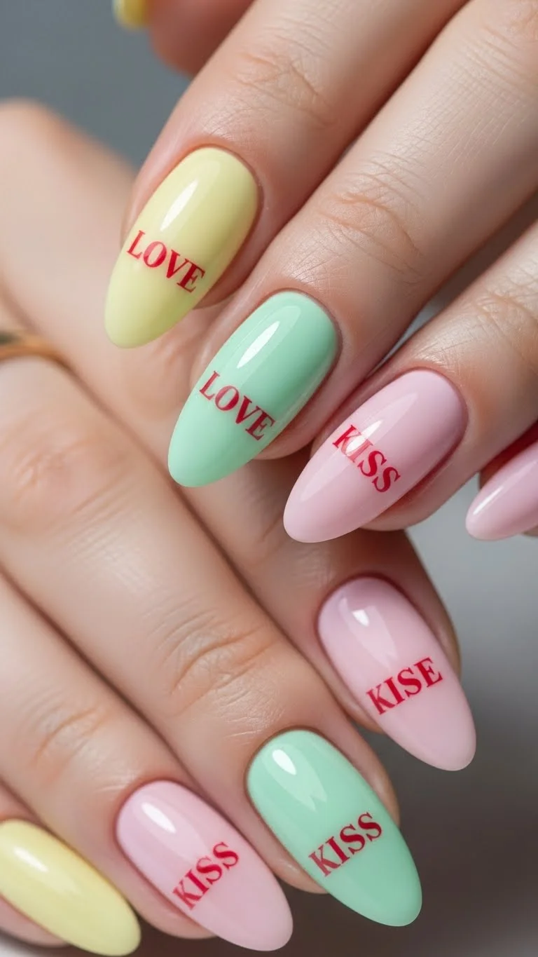 Mimic the classic candy hearts. Use pastel colors like mint, lemon, and peach. Use a fine-tip red nail pen to write short words. If your handwriting is shaky, just use the first letter of a name. It is a nostalgic and cute look. Pastel polishes are usually easy to find in the clearance section after spring.