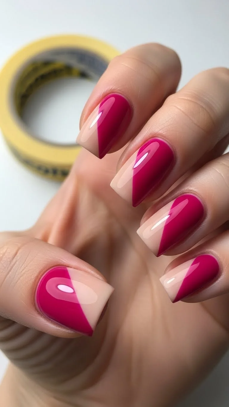 Color blocking is great for a geometric look. Use Scotch tape to cover half the nail diagonally. Paint the exposed side a bright magenta. Pull the tape off while the polish is still wet. This gives you a crisp, straight line. It is a very fast way to get a professional look.
