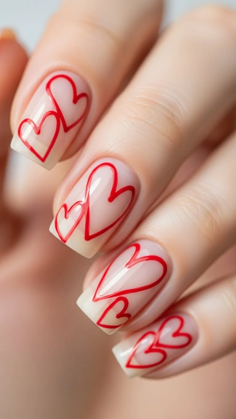 You don’t need perfect hearts. Try drawing loose, “scribble” style heart outlines. Use a thin brush and a steady hand. If the lines are uneven, it just looks like art. This works best on a clear or nude base. It is a modern take on the holiday theme.