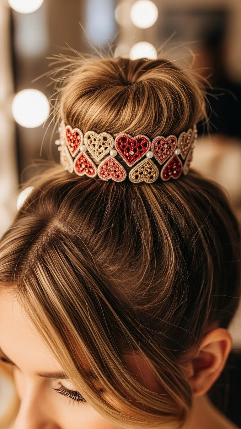 A top knot is chic and easy, and adding an accessory can make it Valentine’s ready. Gather your hair into a high ponytail on top of your head. Twist the ponytail tightly and wrap it around its base to form a bun. Secure with bobby pins. Once your top knot is in place, add a decorative hair clip, a sparkly barrette, or a small flower. These accessories can transform a simple bun into something truly special. This style is practical yet fashionable, keeping your hair out of your face while adding a festive touch. It works for both casual and dressy occasions.